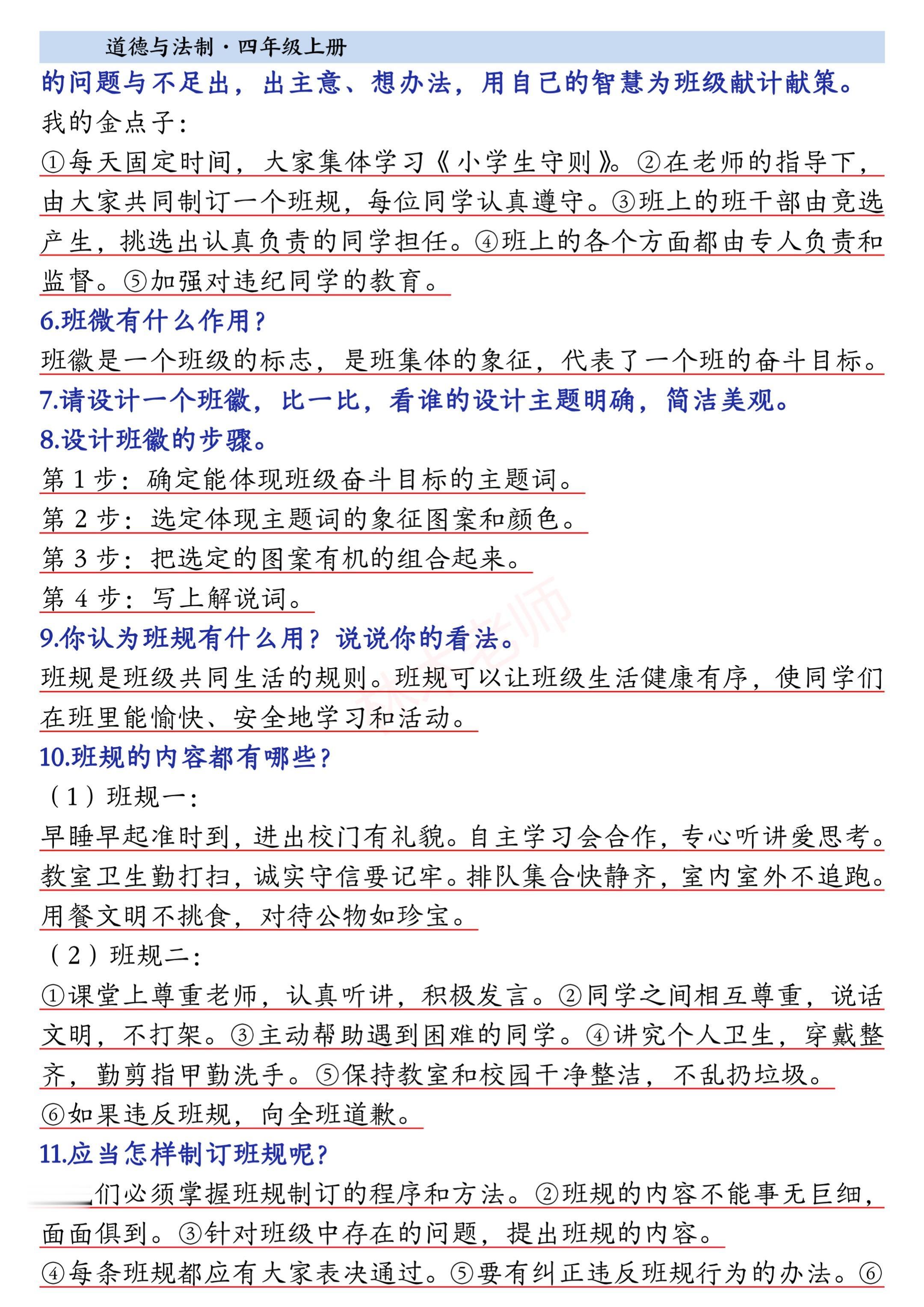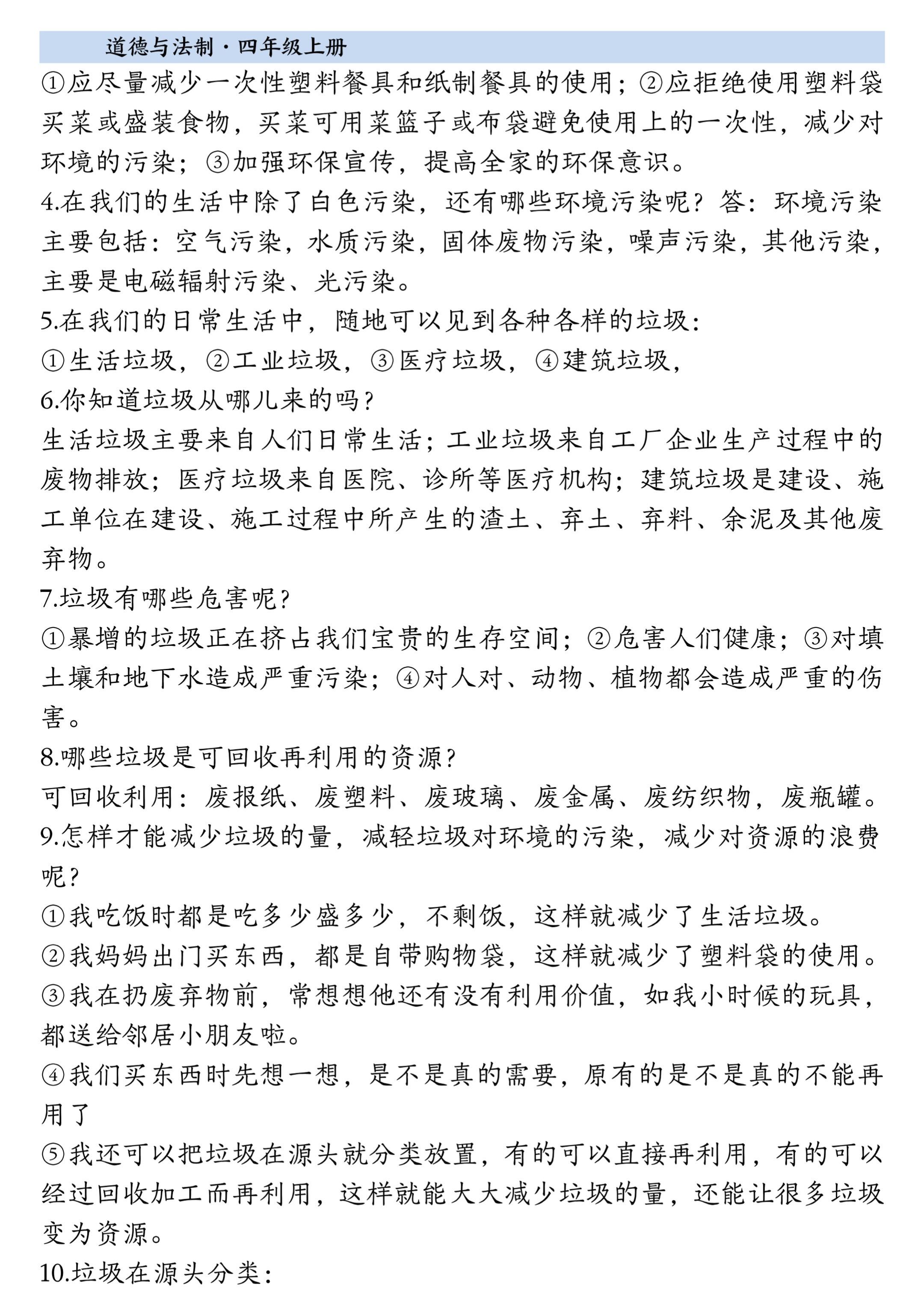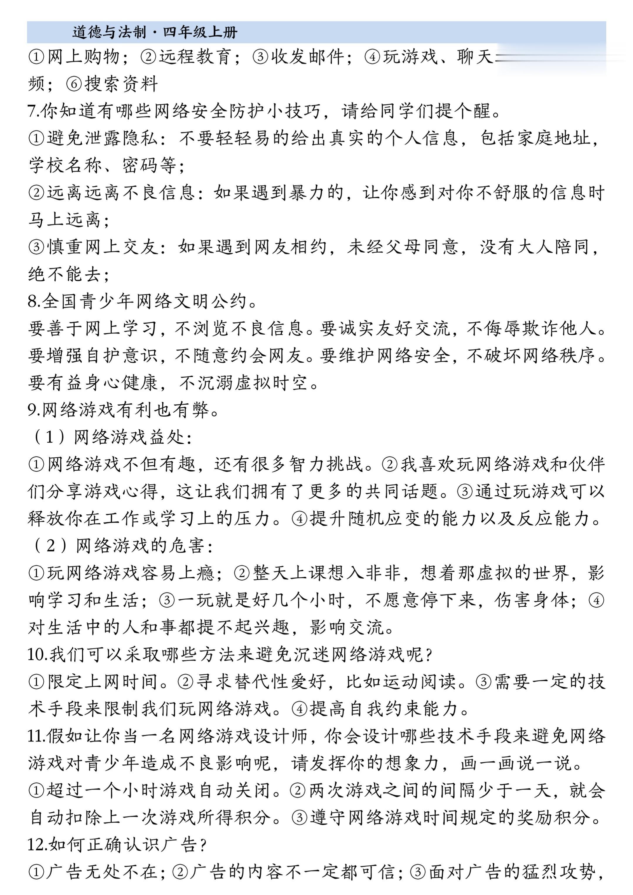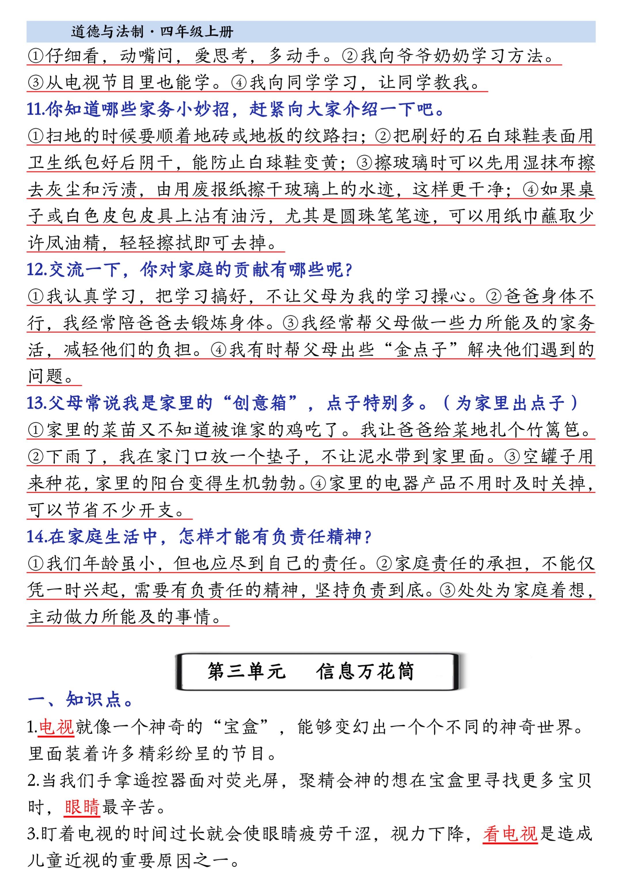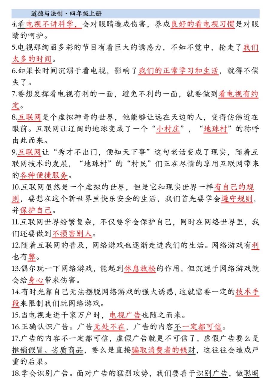 2025小学四年级上册道德与法治知识点。 有需要可以自行下载打印