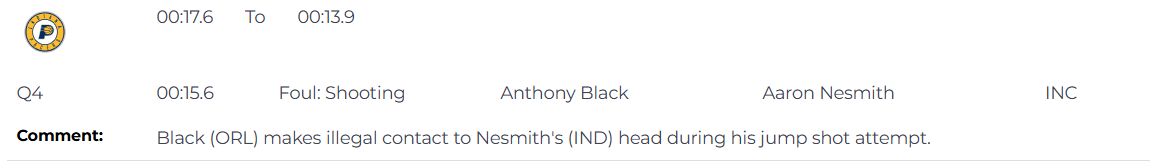 比赛的最后的14.5秒,在步行者球员内史密斯起跳投篮时,魔术队球员布莱克的封盖尝试对内史密斯头部造成了非法接触,应该判罚投篮防守犯规。