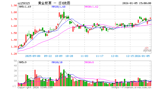 1月5日,黄金股ETF基金(159315)涨2.57%,成交额1689.56万元。当日份额减少50.00万份,最新份额为9258.96万份,近20个交易日份额减少600.00万份。最新资产净值计算值为1.60亿元。