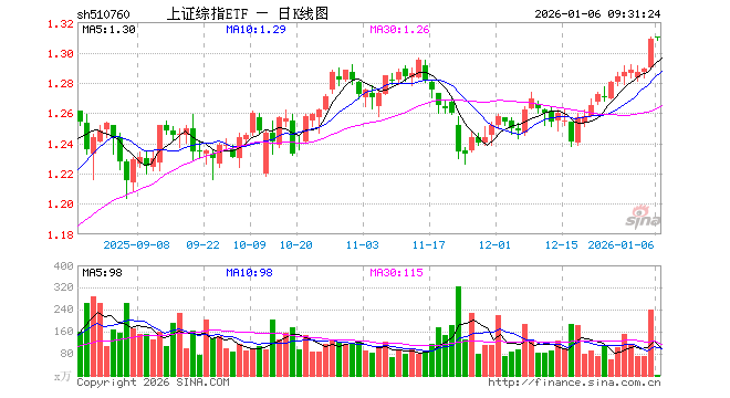 1月6日,上证综指ETF(510760)开盘涨0.08%,报1.310元。上证综指ETF(510760)重仓股方面,农业银行开盘涨0.00%,工商银行跌0.13%,贵州茅台涨0.46%,中国石油跌0.20%,招商银行涨0.24%,工业富联涨0.00%,中国人寿涨0.00%,寒武纪跌0.72%,中国银行涨0.00%,中国平安涨0.06%。