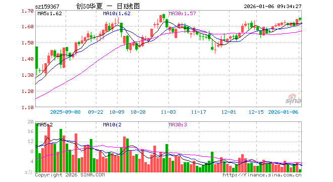 1月6日,创业板50ETF华夏(159367)开盘涨0.49%,报1.651元。创业板50ETF华夏(159367)重仓股方面,宁德时代开盘涨0.66%,中际旭创跌2.81%,东方财富跌0.29%,新易盛跌3.90%,阳光电源涨0.10%,胜宏科技跌1.33%,汇川技术涨0.43%,迈瑞医疗涨0.45%,亿纬锂能涨0.72%,同花顺涨0.28%。