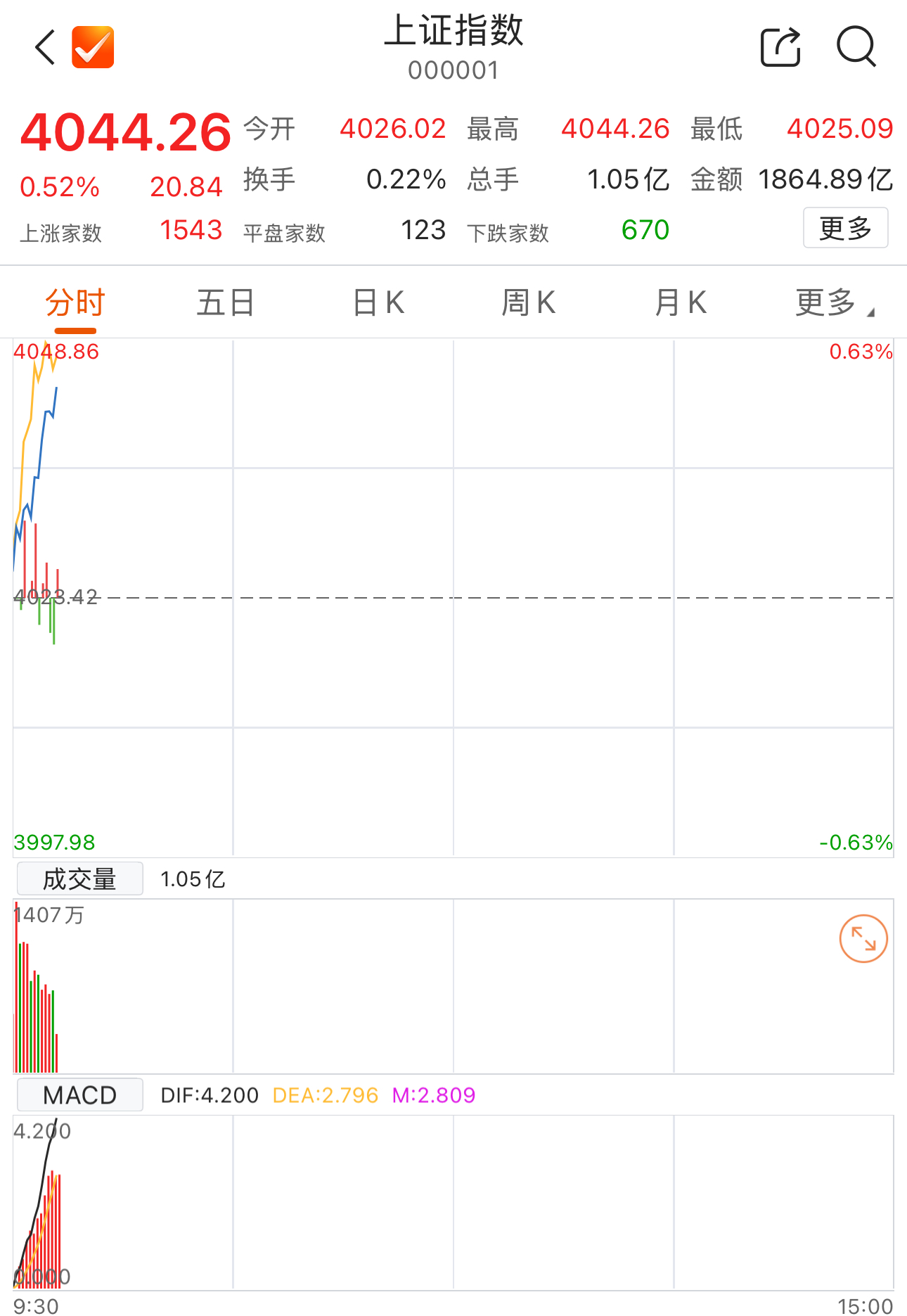 上证报中国证券网讯1月6日,上证指数盘中持续走强,突破2025年11月14日的阶段高点,刷新10年来新高。截至9时41分,上证指数涨0.52%,盘中最高报4044.26点。