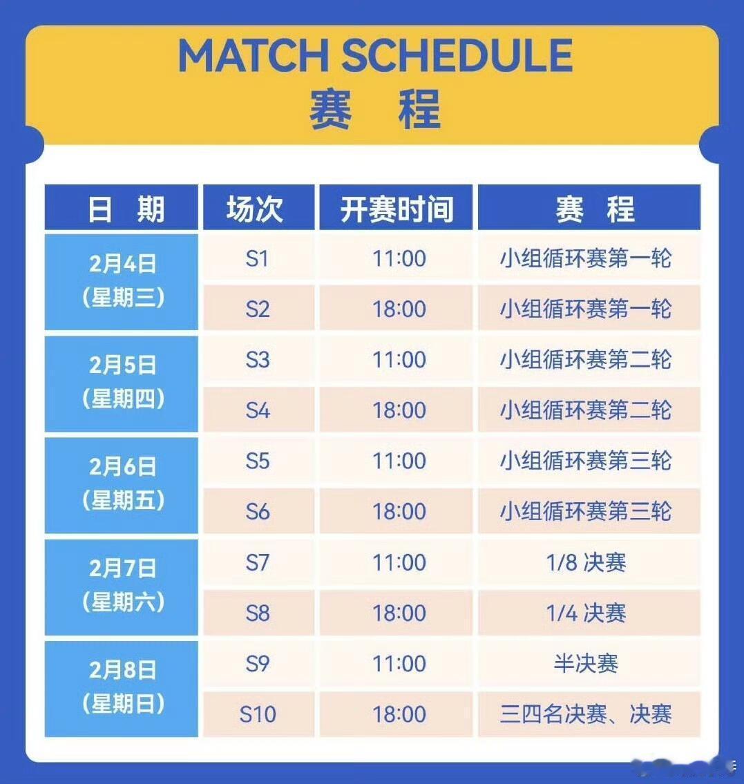 02月04日-02月08日(5天)📍中国,海口 | 海口五源河体育馆🏟【男单】王楚钦、林诗栋、梁靖崑、向鹏、陈垣宇、周启豪【女单】孙颖莎、王曼昱、蒯曼、陈幸同、王艺迪、陈熠🔹小组赛、1/8决赛:5局3胜1/4决赛、半决赛、决赛:7局4胜🔹2月4日(周三)-- 小组赛第1轮2月5日(周四)-- 小组赛第2轮2月6日(周五)-- 小组赛第3轮2月7日(周六)-- 1/8决赛、1/4决赛2月8日(周日) -- 半决赛、铜牌赛&决赛🔹冠军 500分丨亚军 350分丨四强 175分丨八强 90分丨十六强 10分