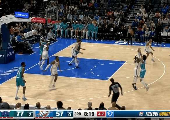 第三节比赛中,拉梅洛-鲍尔连续神仙球投进,黄蜂领先23分打停雷霆。