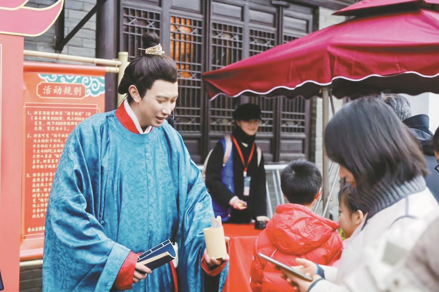 1月3日,元旦假期的最后一天,山阴城隍庙会依然人声鼎沸。穿过街巷檐角,一位身着宝蓝色长袍的“陆游”被往来游客簇拥着,不断有人上前抽取诗签、对答下联,或是合影互动。这位“陆游”,实际上是庙会特别设置的NPC(即非玩家角色)演员。元旦假期,NPC互动再次成为庙会的一大亮点,获得了众多游客的喜爱。在追求沉浸式体验的当下,NPC正逐渐成为文旅市场的“气氛担当”。