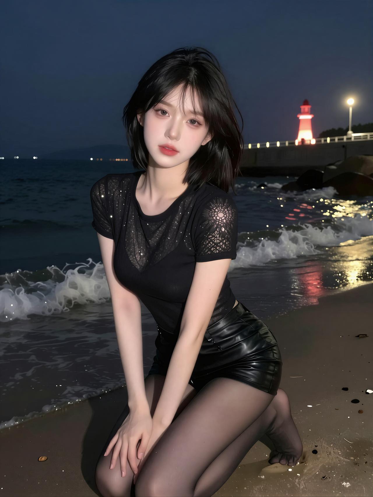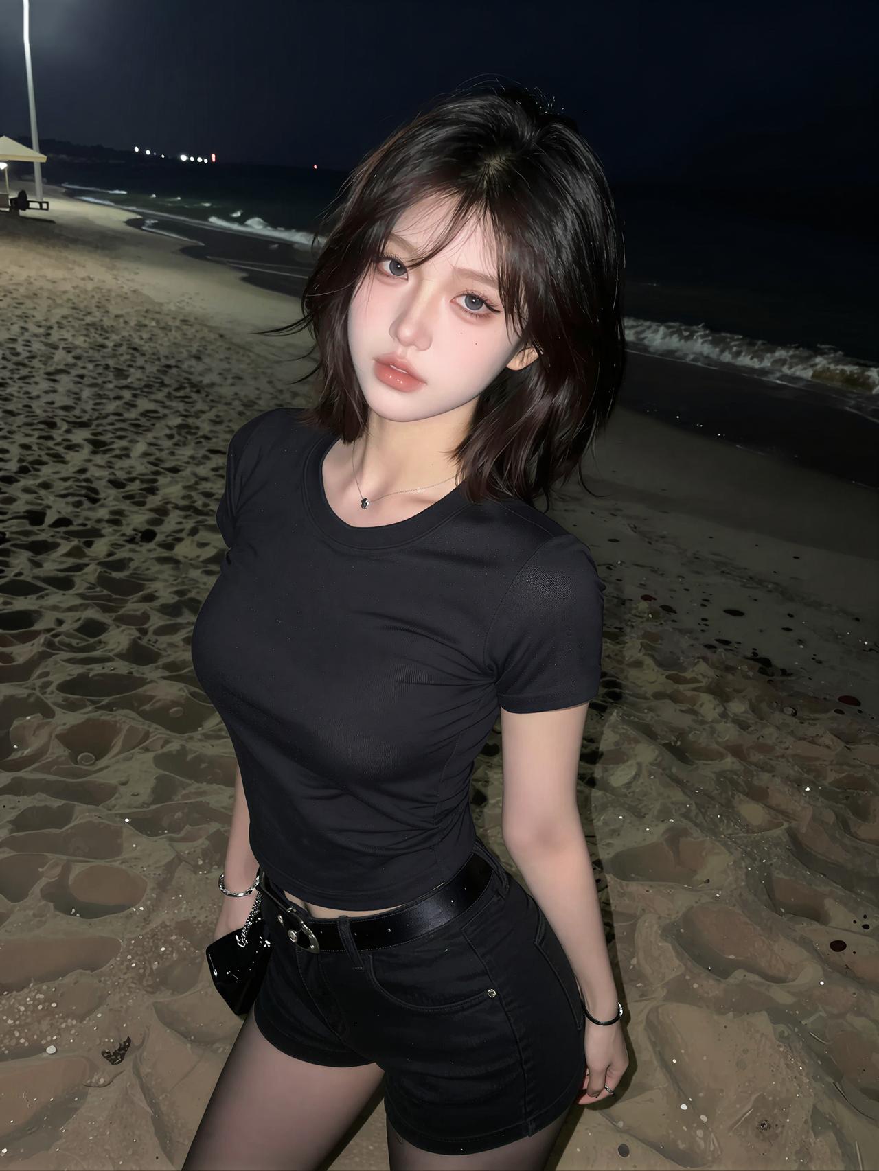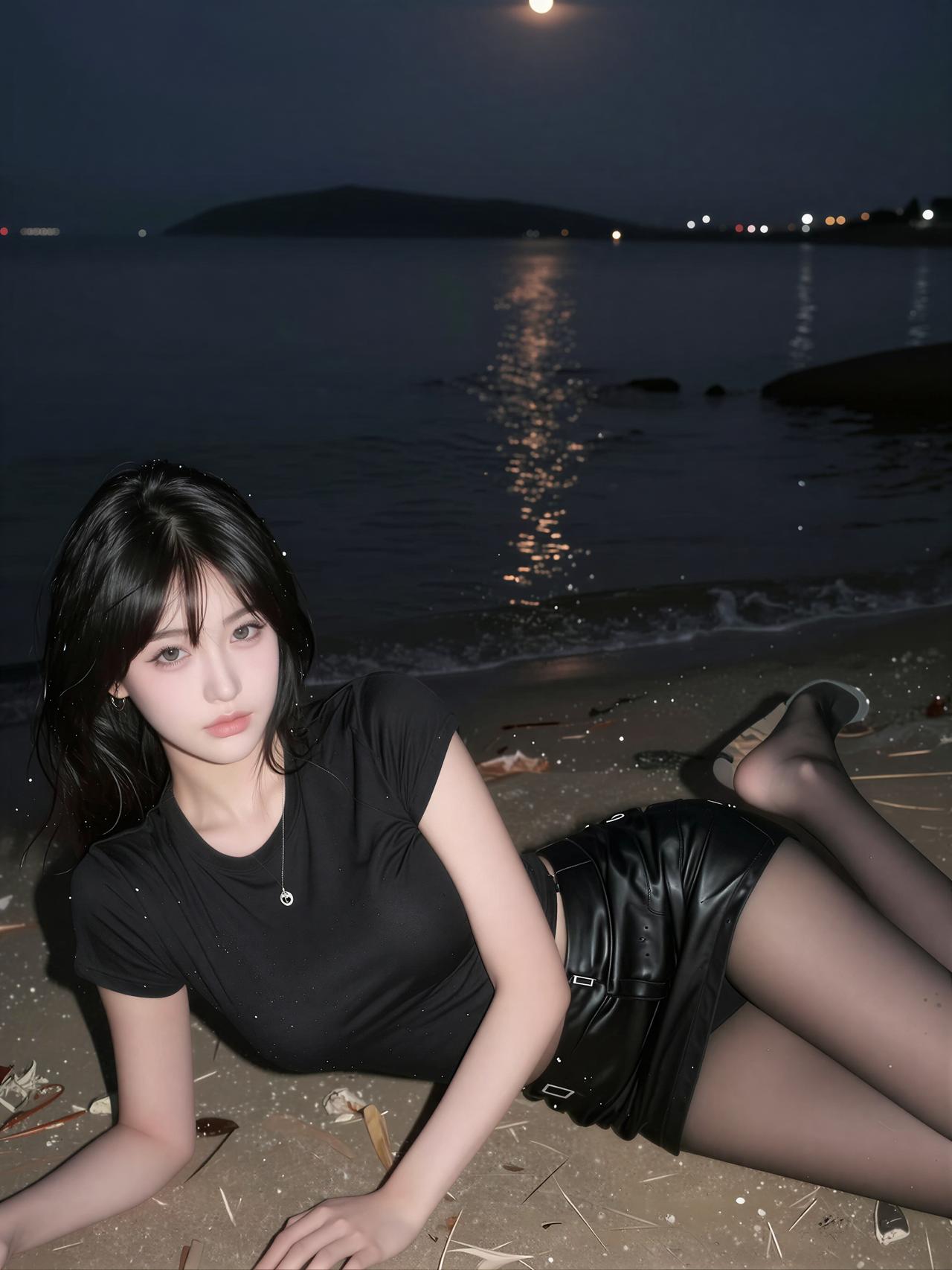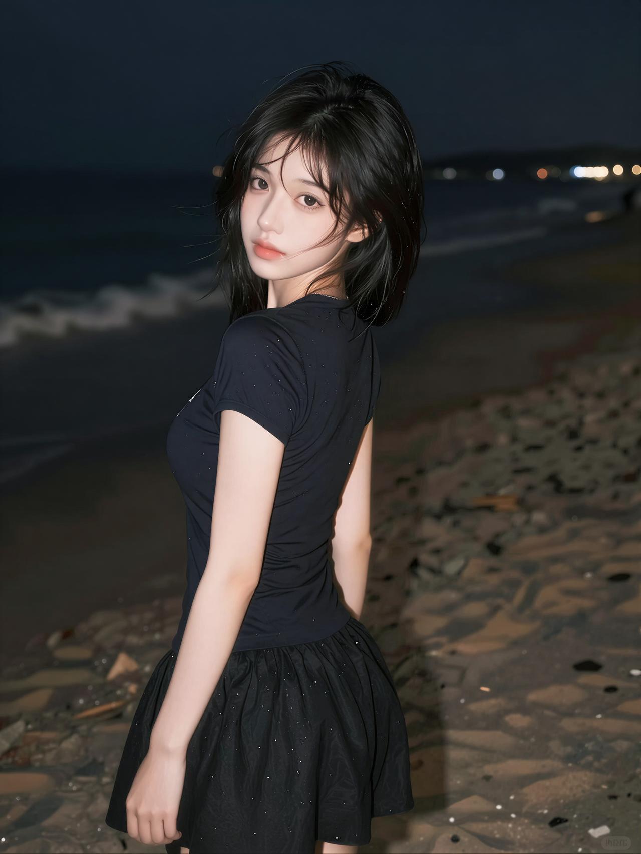 夜晚海边,黑衣少女,温柔夜色,浪漫氛围