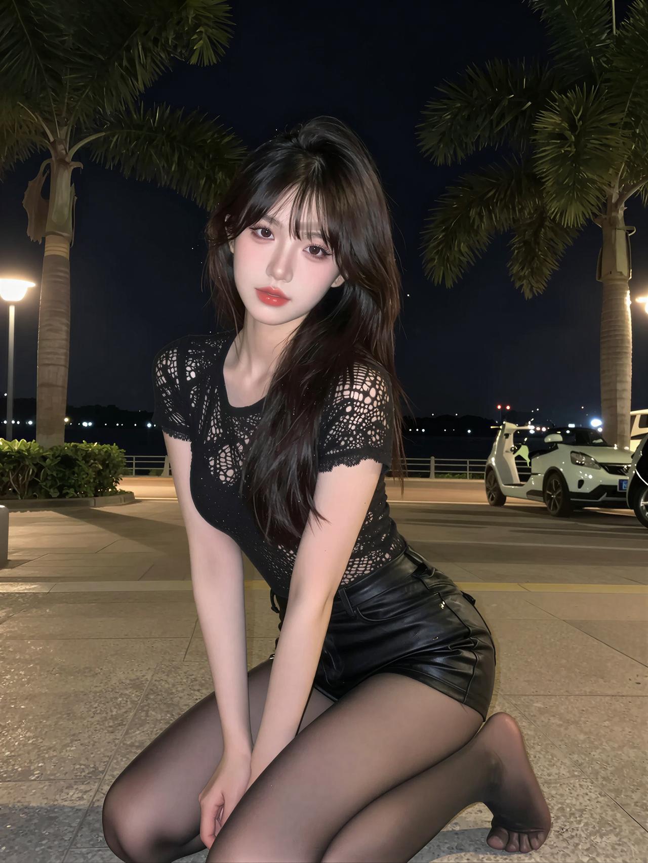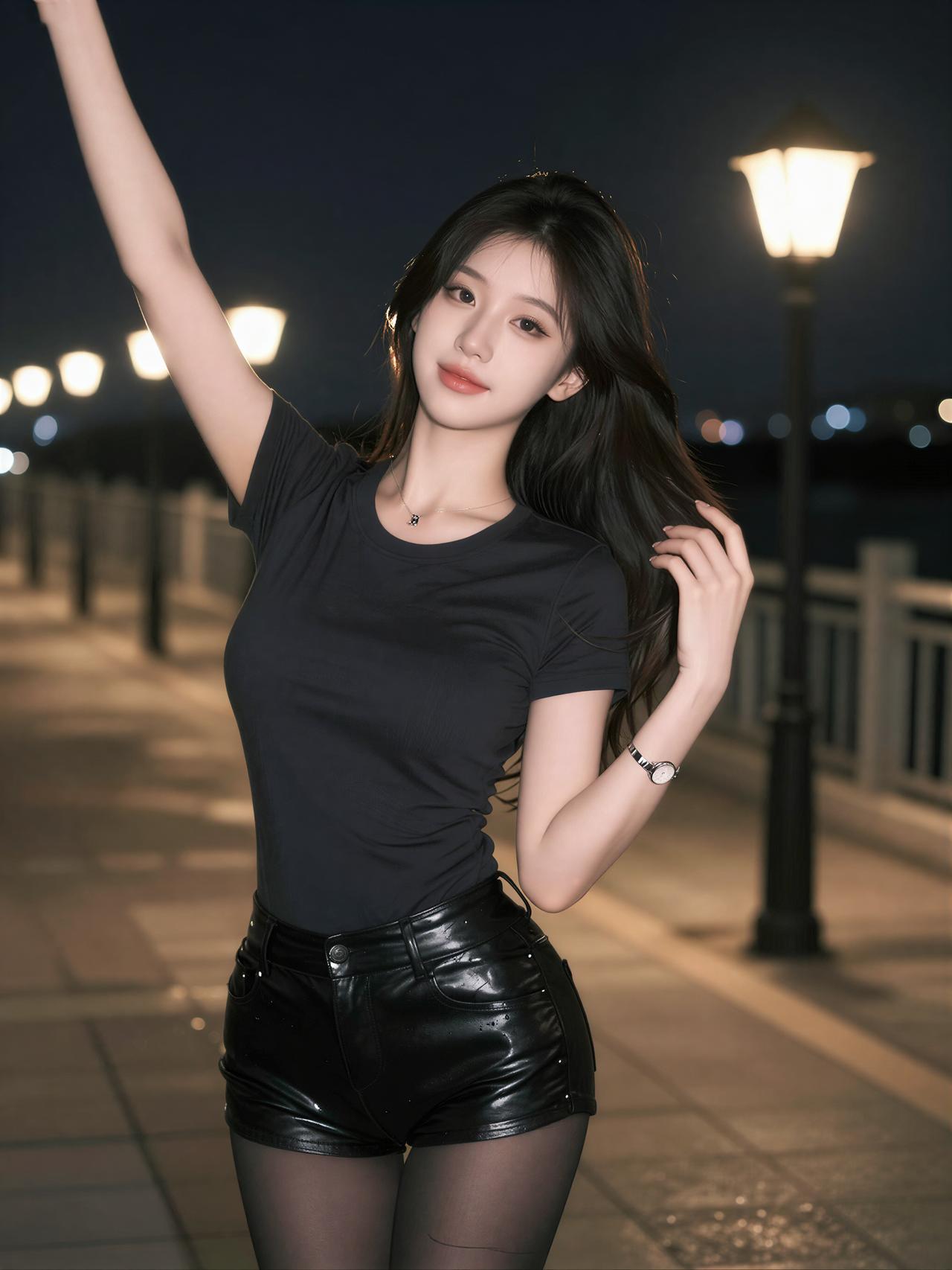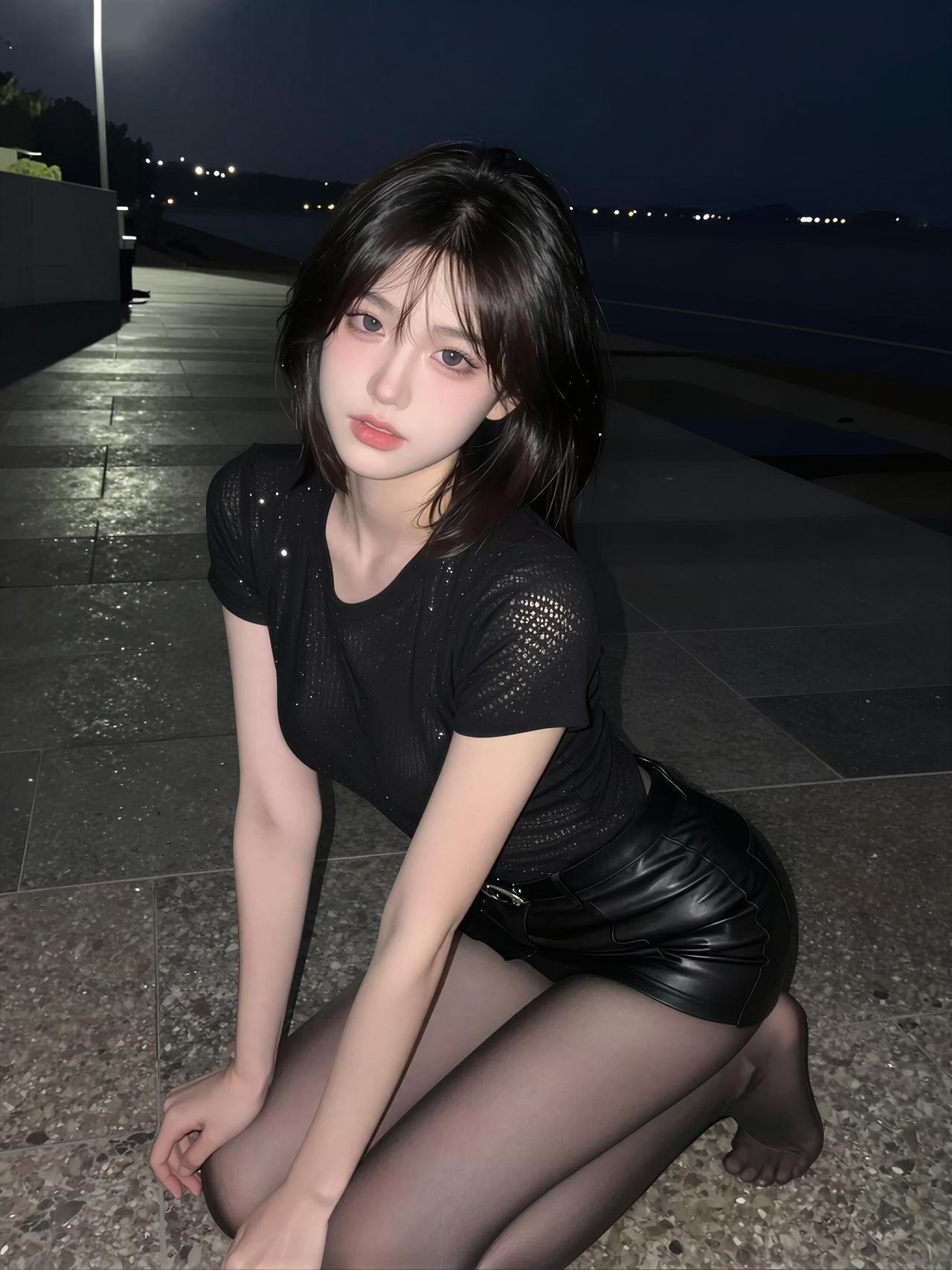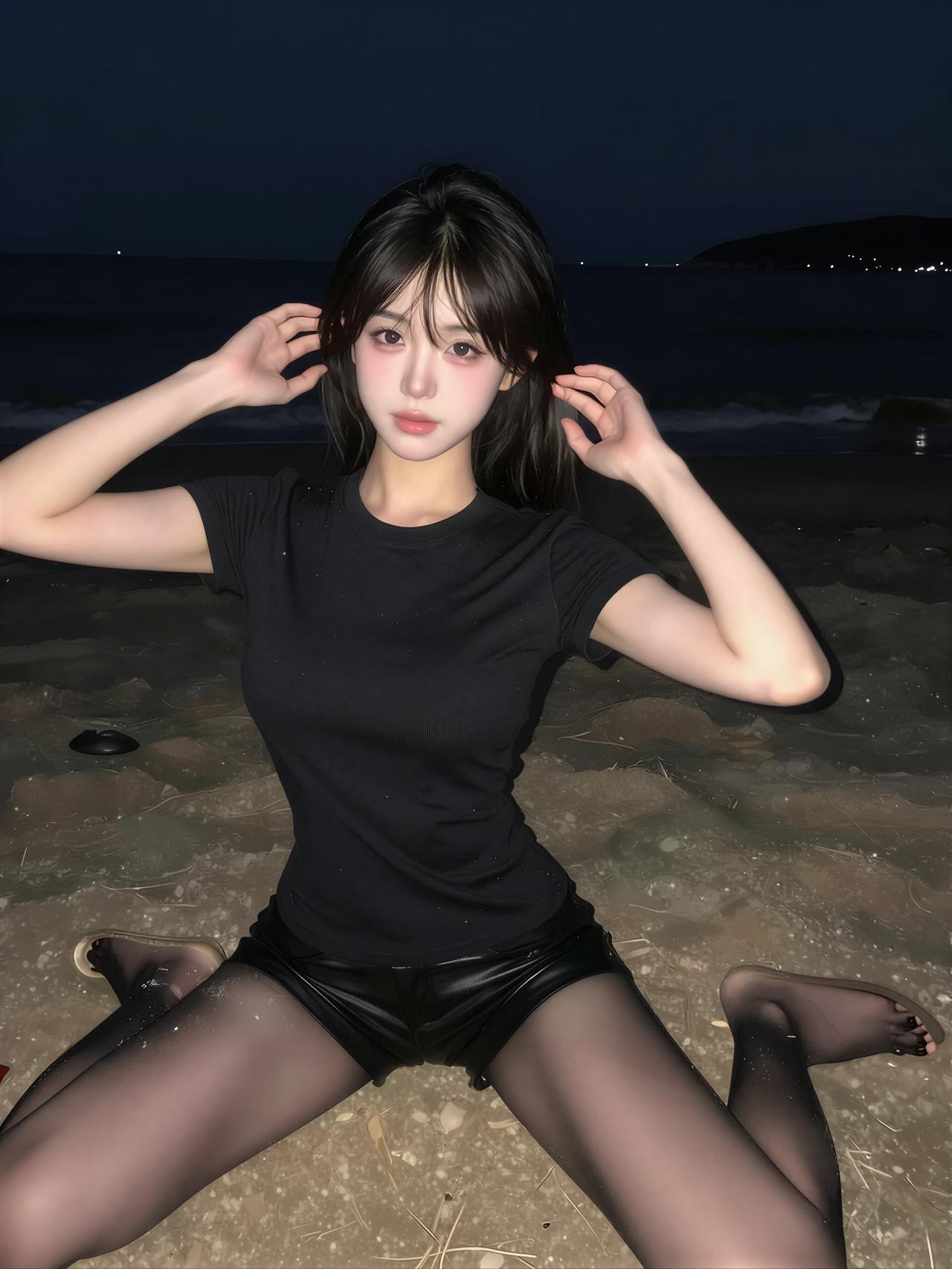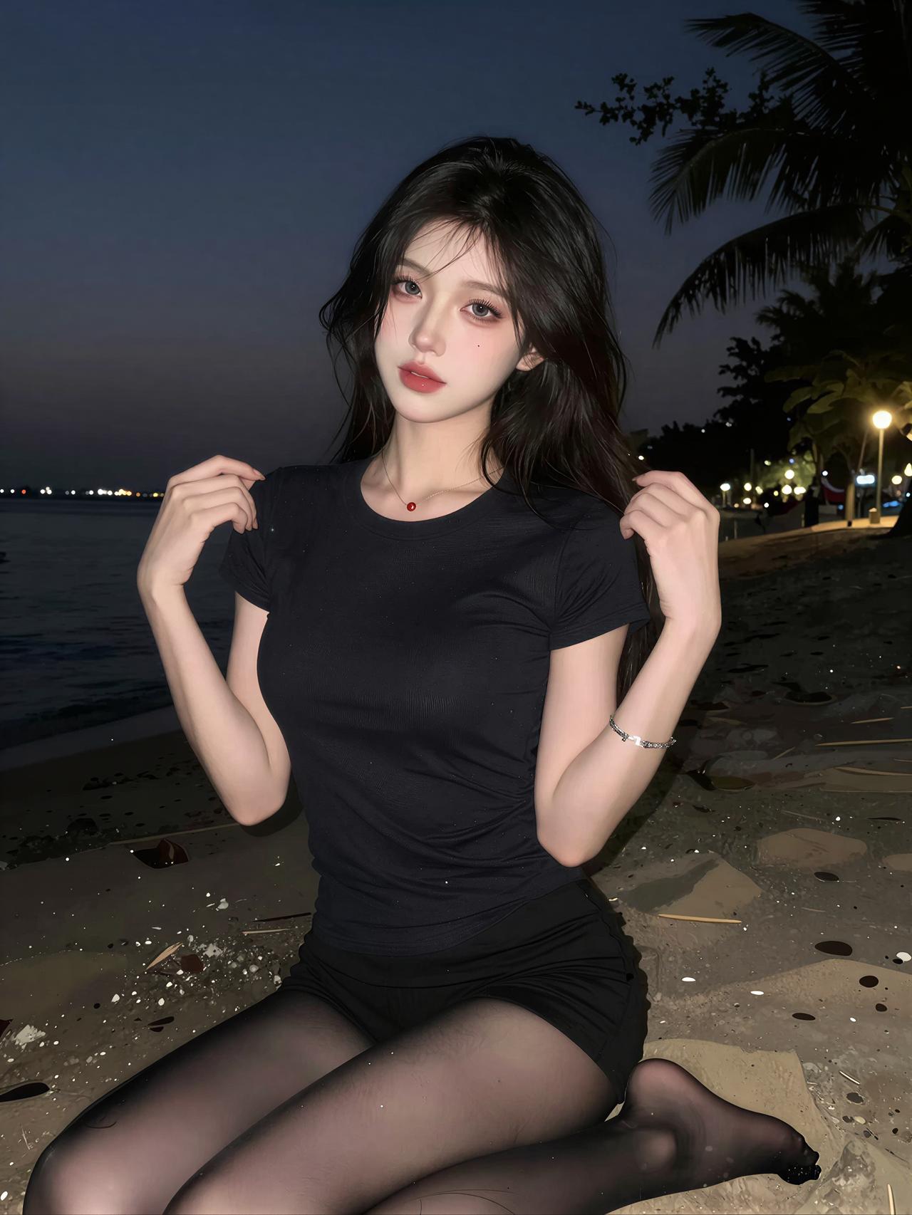 夜晚海边,黑衣少女,温柔夜色,浪漫氛围