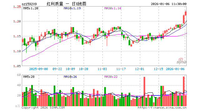 1月6日,截止午间收盘,中证红利质量ETF(159209)涨1.07%,报1.232元,成交额2483.71万元。中证红利质量ETF(159209)重仓股方面,福耀玻璃截止午盘跌0.78%,贵州茅台涨0.05%,新和成涨2.15%,吉比特涨1.68%,山金国际涨2.39%,南山铝业涨3.45%,海天味业涨0.82%,亿联网络涨0.42%,药明康德涨1.72%,纽威股份跌2.61%。