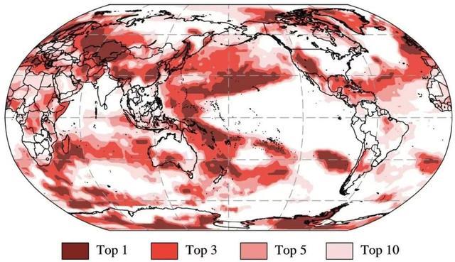 2025年东亚北部和南部、中亚大部、欧洲东部、北美洲北部和南部、南极洲大部及太平洋西北部、西部以及东南部、印度洋南部和大西洋中部年平均温度均位列历史前三且中心区域突破高温历史纪录(图3)。