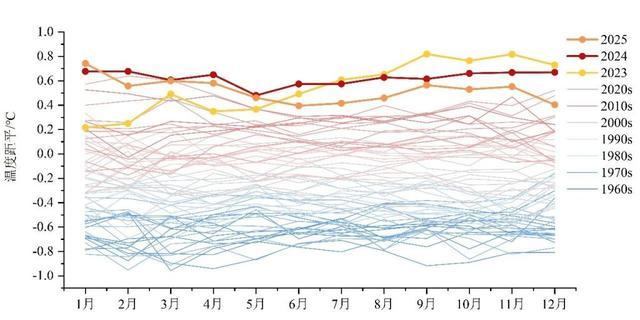 图2全球地表月平均温度距平(1961年1月至2025年12月,相对于1991-2020年同期平均值)2025年用橙粗线表示,2024年用红粗线表示,2023年用黄粗线表示,其他年代用细线表示,从浅蓝色(1960年代)到浅红色(2020年代)