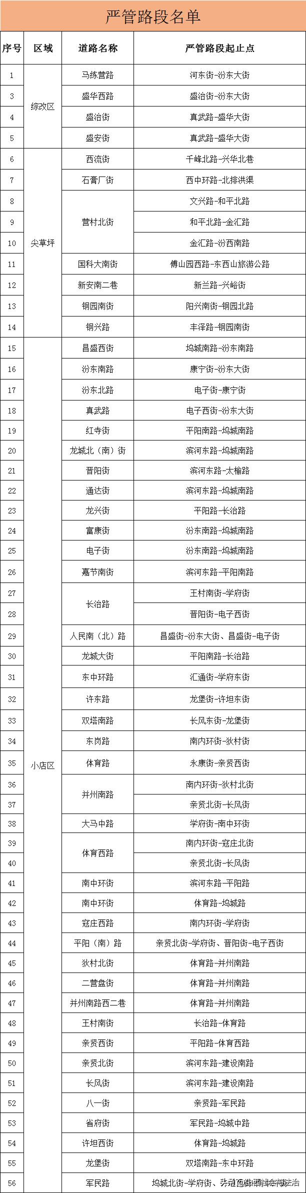 为改善城市道路交通环境,规范停车秩序,提高道路通行效率,结合目前市区停车现状和群众反映较为突出的停车乱点,根据《中华人民共和国道路交通安全法》《中华人民共和国道路交通安全法实施条例》《山西省实施〈中华人民共和国道路交通安全法〉办法》及相关规程,公安机关交通管理部门经过综合研判和认真梳理,决定将下列道路新增为严格管理道路(简称“严管道路”),具体事项公布如下: