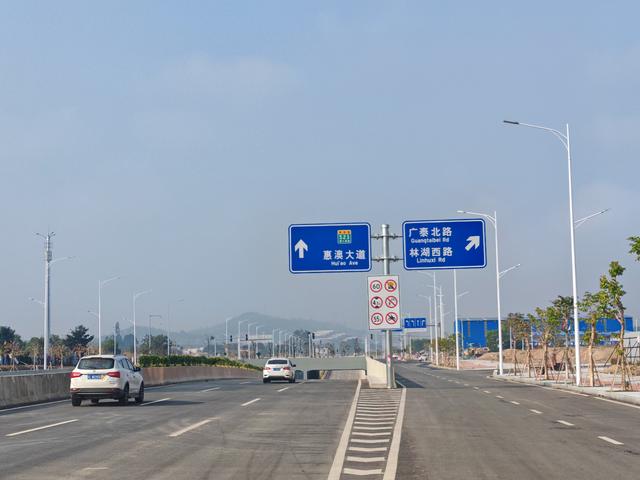 此次通车的宏达路(惠大高速至一号公路段)工程(一期),起于惠大高速西侧,终于林湖路,全长1.77公里,含惠大高速和广泰北路两处立交节点,采用城市主干路标准(快速化设计),设计时速60公里,双向8车道,两侧设置人行道及非机动车道。