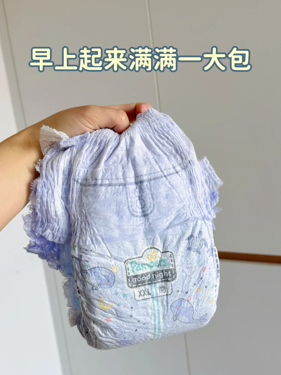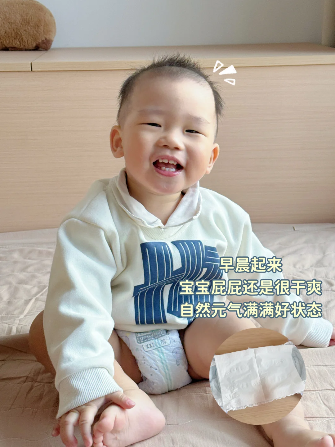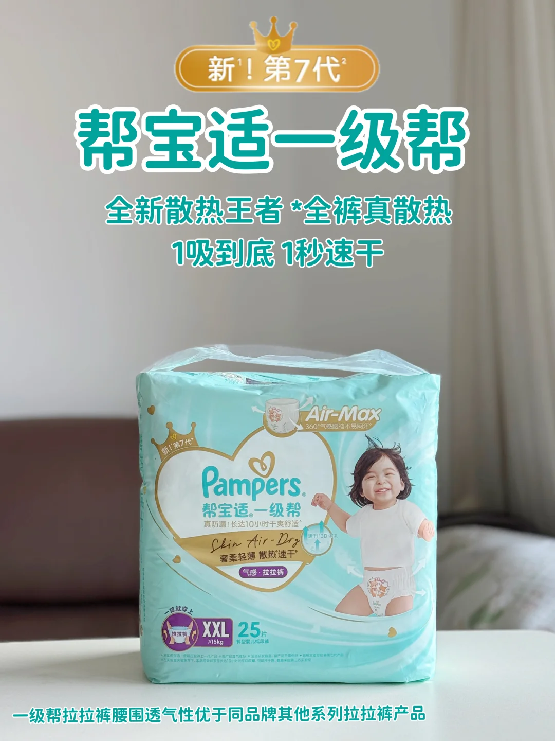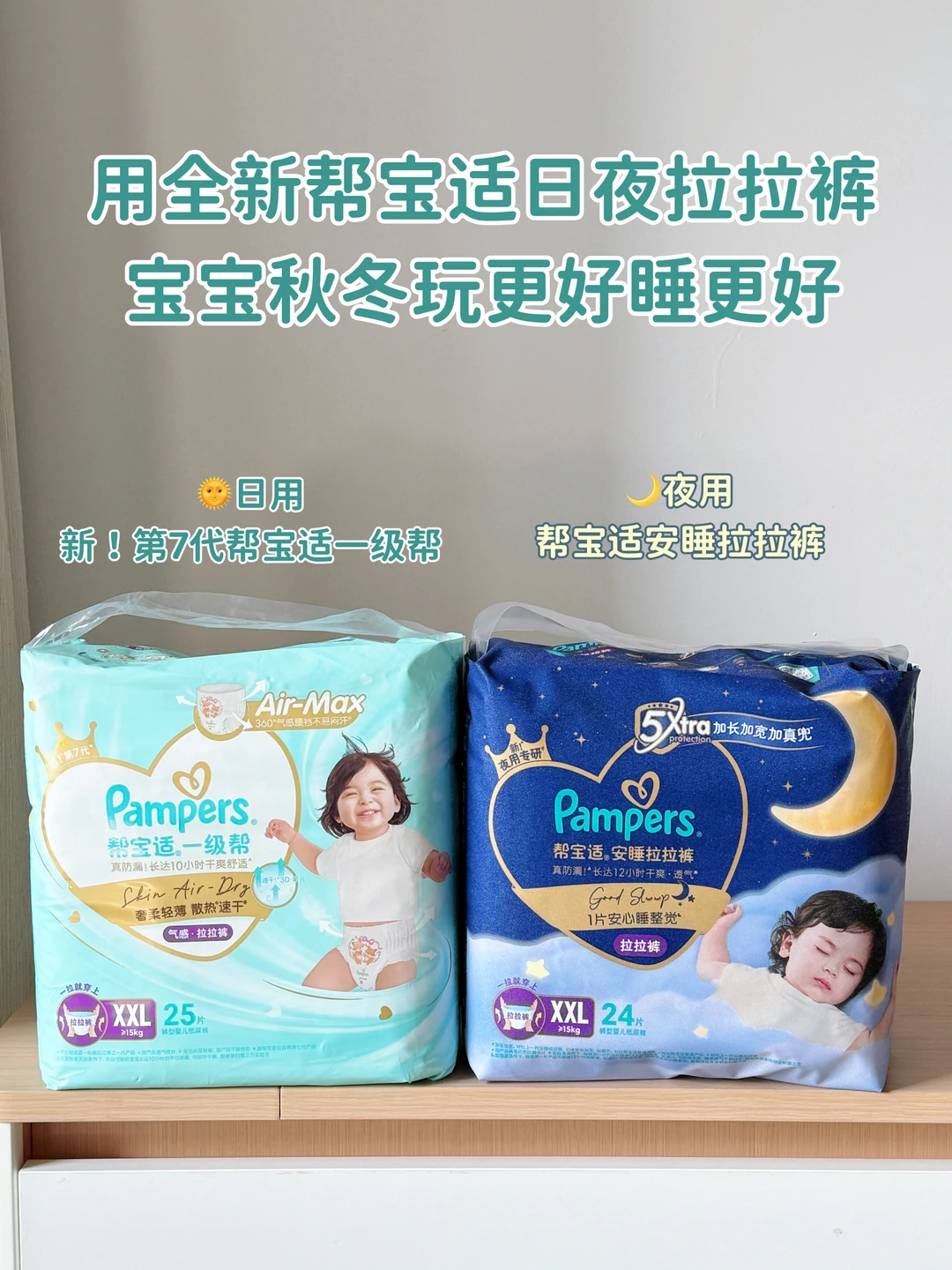 白天我搭配用新第7代帮宝适一级帮,夜用同款AirMax气感科技,速干不闷湿。吸收超快,尿湿瞬间就锁住,宝宝怎么疯玩都不怕漏,不用担心尿湿裤子着凉~