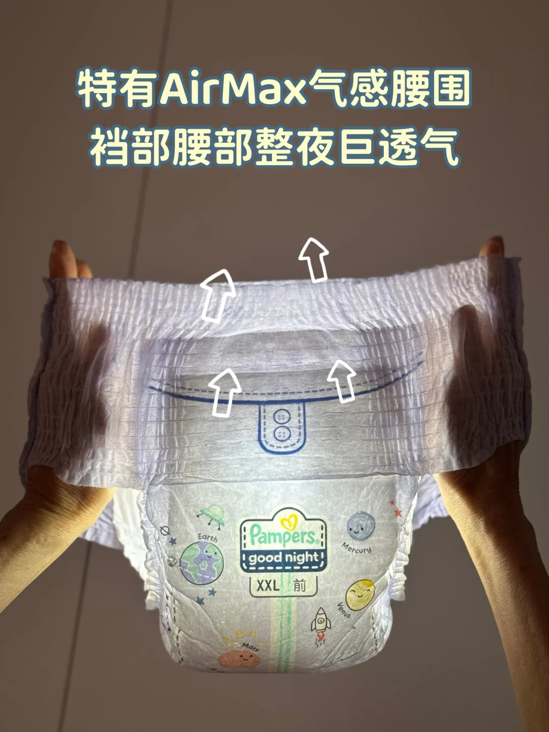 搭配AirMax气感科技速干散热的,宝宝很多时候就是感觉屁屁闷湿才会醒,现在我每天早上醒来都能看到满满一个炸尿包,但是宝宝屁屁还是干爽的!小家伙一睡一整夜不带醒的~