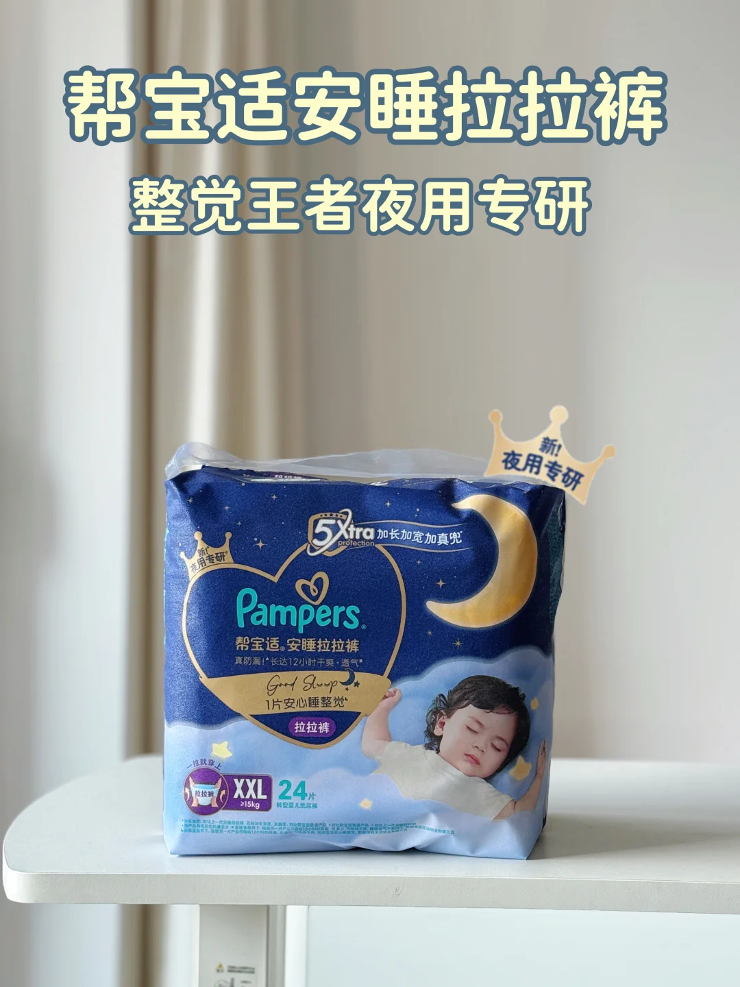 在这5步里至关重要的一步来了,大概就是我们选对适合夜用的安睡拉拉裤-帮宝适整觉王者安睡拉拉裤,再也不用半夜被迫玩“换尿布大冒险”!