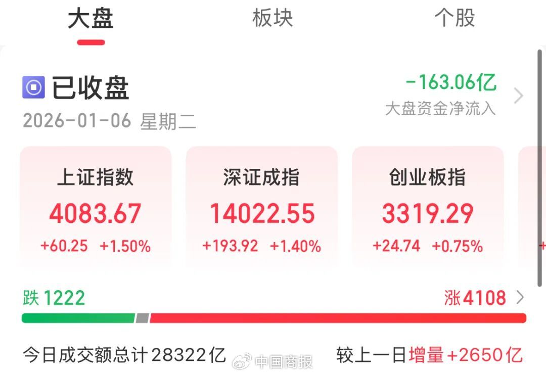 截至收盘,上证指数涨1.5%,报4083.67,创10年新高;深成指涨1.4%,创业板指涨0.75%,北证50指数涨1.82%。沪深京三市成交28322亿元,较上一日增量2650亿元,超4100只个股上涨。