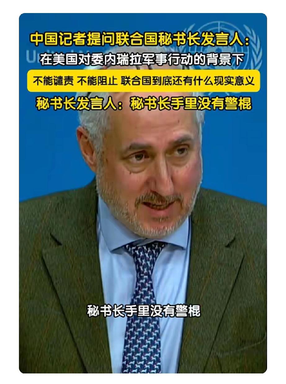 1月5日中国记者这一问太犀利了!在美国对委内瑞拉军事行动背景下,联合国不能谴责、阻止,其现实意义确实要打个问号。 联合国成立初衷是维护国际公平正义和新秩序,《联合国宪章》也明确规定成员国不能用武力侵害他国。美国作为创始国和签字国,却肆意妄为。发言人说秘书长没“警棍”,成员国应履行承诺,可美国明显没做到。现在的联合国仿佛成了美国及其西方强权的代言人、霸权遮羞布。世界要公平正义,南方国家真得团结起来,在各方面打败美帝国主义,让世界有安宁和平。