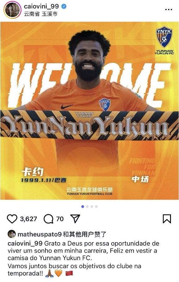 直播吧1月6日讯正式加盟云南玉昆后,巴西外援卡约更新社媒,表达了自己的加盟感言。
