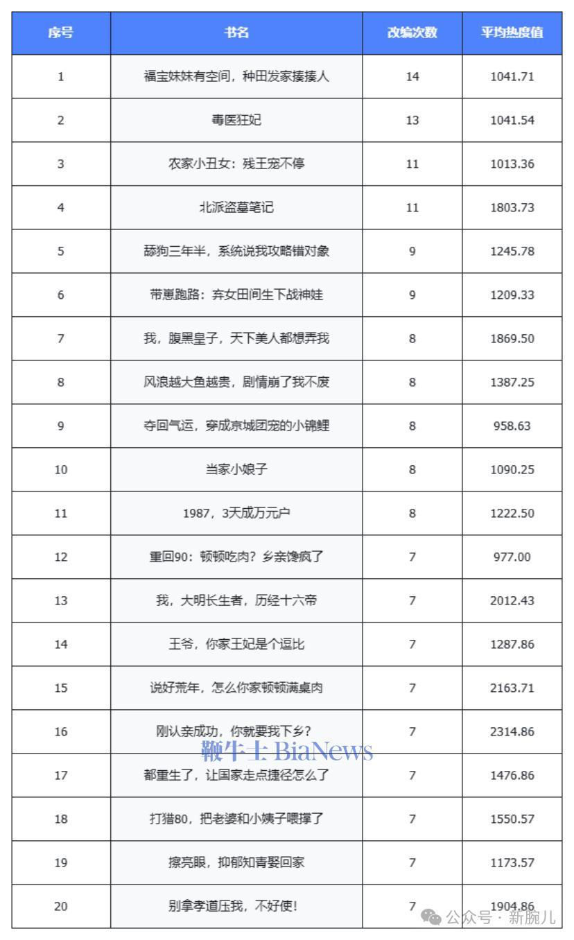 例如下表中改编次数14次的《福宝妹妹有空间,种田发家揍揍人》,制作的漫剧平均热度值为1041.71万,还有《刚认亲成功,你就要我下乡》改编7次了,总热度值2314.86万。