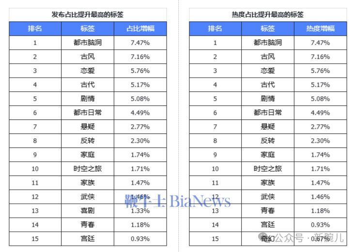 都市脑洞标签占比从0.6%增至8.07%,热度从3518万升至5234万,热度值增幅49%;