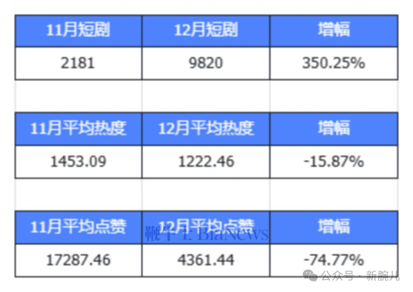 12月发行数据暴涨,影响了新剧的平均热度值/点赞数据。说明市场容量与剧集产量倒挂,未来市场将结合字节审核情况做进一步收紧,如此一来,会加速挤压劣质产能。