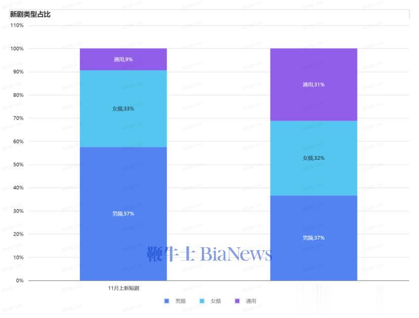 通用题材迅速增长,11月占比的9%飙升至12月的31%,增长了22%,单是题材的内容数量增长率高达244.44%,是所有频道中变化最显著的,表明短剧市场正在向更广泛的受众群体拓展。