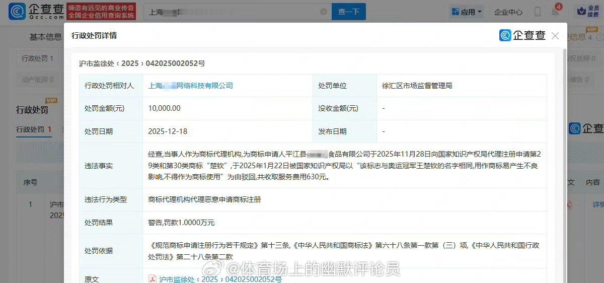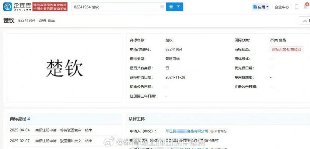 抢注楚钦商标被罚1万,王楚钦实火,名字都被盯上了,企查查显示,一机构代理“楚钦”商标注册因与王楚钦同名被驳回,涉恶意申请遭警告并罚1万元,并收费630元。驳回理由:该标志与奥运冠军王楚钦的名字相同,用作商标易产生不良影响,不得作为商标使用。()