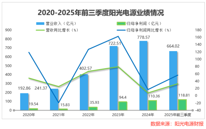 2025年前三季度,阳光电源实现营收664.02亿元,同比增长32.95%;净利润118.81亿元,同比大增56.34%,已超过2024年全年净利润,业绩表现亮眼。