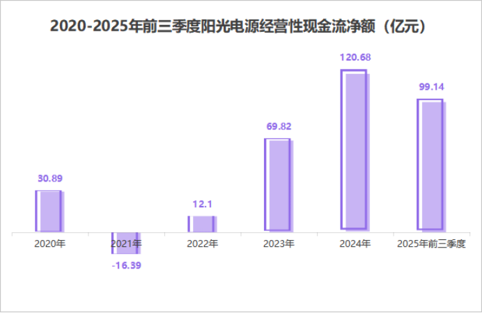2025年前三季度,在光伏设备公司中,阳光电源经营性现金流净额达99.14亿元,同比猛增1133.14%,规模位居行业第一。