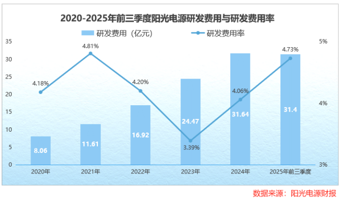 2025年前三季度,阳光电源研发费用为31.4亿元,同比大增32.15%,研发费用率为4.73%。
