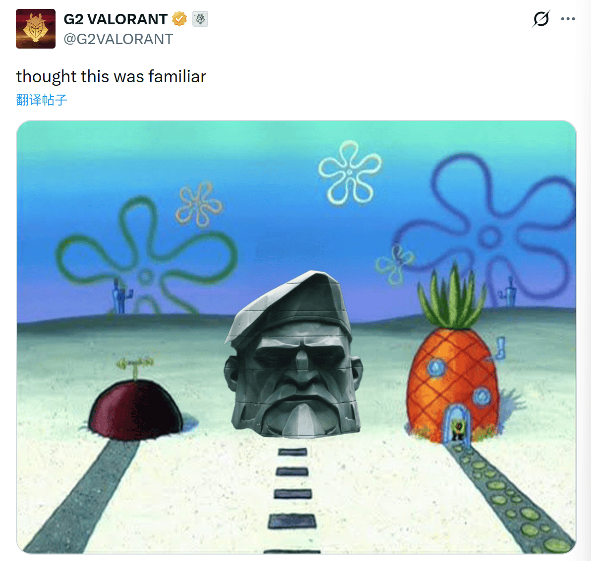 虎扑01月06日讯G2整活,将无畏契约新CG《为何还击》里炼狱雕像的头代替章鱼哥的家,配文:"好眼熟啊。"