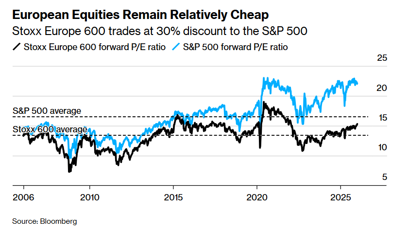 尽管欧洲股市并非处于最便宜水平——其远期市盈率目前已高于15x,但这项估值指标仍低于标普500指数,后者的远期市盈率基准估值约为22x。策略师们表示,这一约30%的折价,加之资金对欧洲央行大幅降息推动之下的欧洲经济增长改善的愈发强劲预期,可能推动资金流向该地区股市。