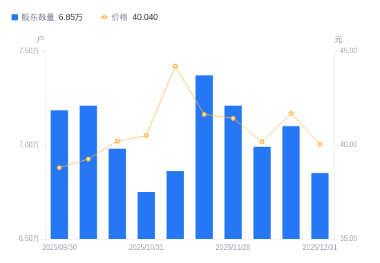 日期A股户数(户)流通A股户均持股数(股)户均持股市值(万元)2025-12-31685006778.2827.142025-12-19710006539.6127.262025-12-10699006642.5226.682025-11-28721006439.8426.672025-11-20737006299.9626.232025-11-10686006768.3229.922025-10-31675006878.6227.862025-10-20698006651.9626.742025-10-10721006439.4925.282025-09-30718486462.0825.07