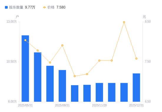 近一年(2024年12月31日至2025年12月31日),中百集团A股股东户数从11.7万户,减低至9.77万户,降幅16.53%,区间股价下跌36.25%。