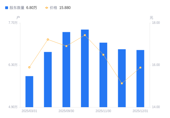 日期A股户数(户)流通A股户均持股数(股)户均持股市值(万元)2025-12-31680006731.6410.692025-12-20682586706.2010.152025-11-30704256499.8510.722025-10-31747836121.0710.662025-09-30739576189.4310.462025-06-30673386797.8211.702025-03-31593297715.4812.262024-12-31685316679.488.362024-09-30671926812.597.902024-06-30800645566.055.64