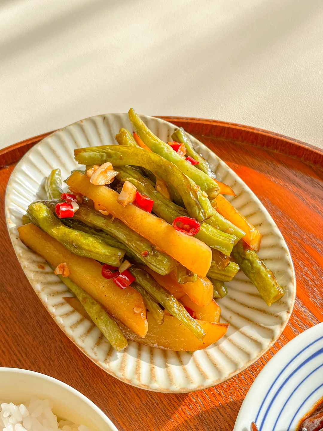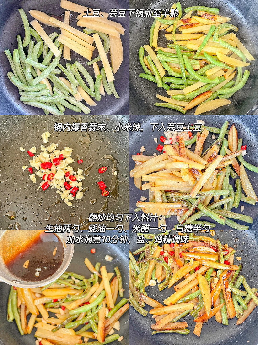 2.锅内爆香蒜末、小米辣,下入芸豆土豆条,翻炒均匀,加入料汁:生抽两勺、蚝油一勺、米醋一勺、白糖半勺