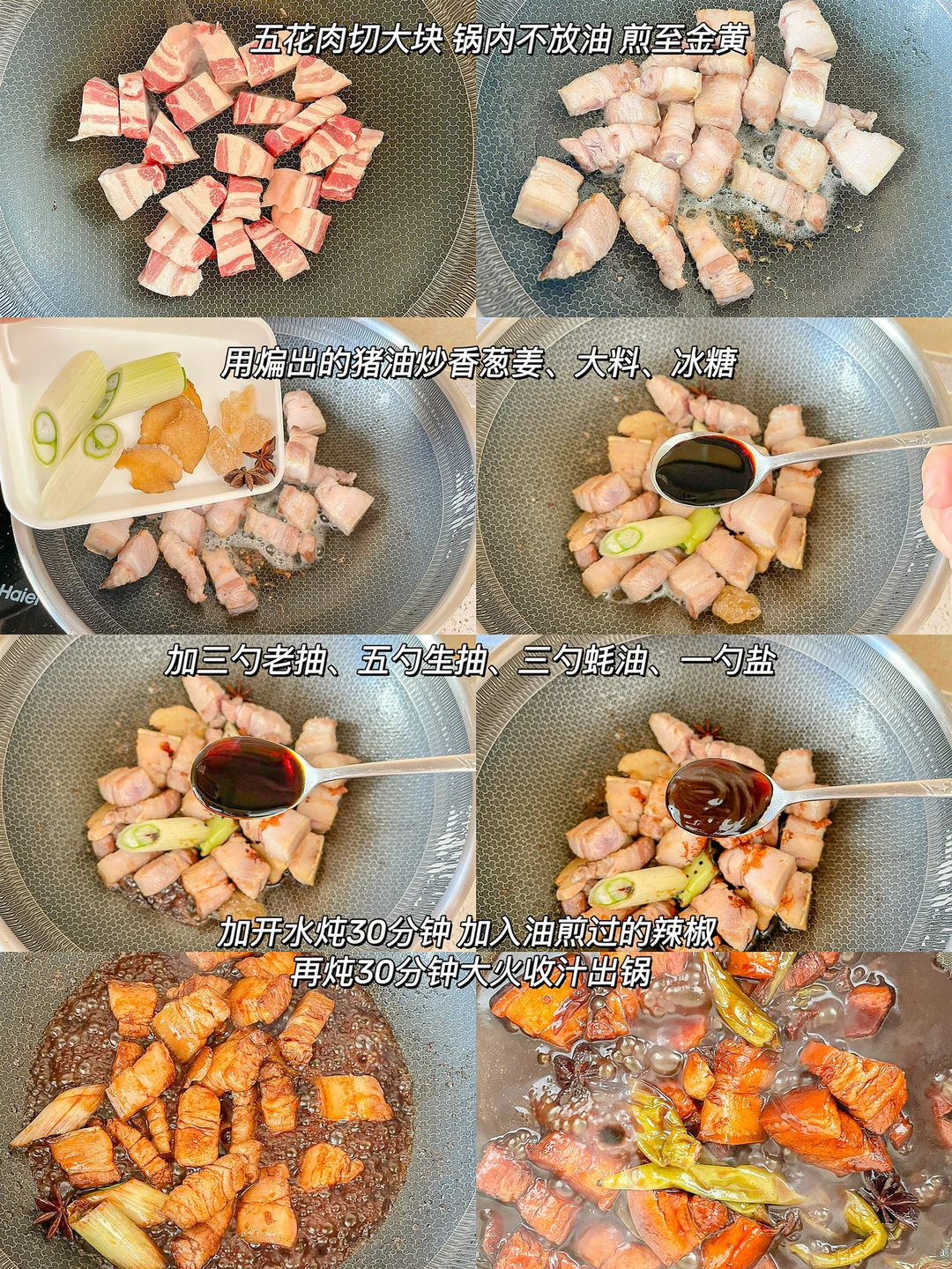 1.五花肉切大块,锅内不放油,把五花肉煎出油脂