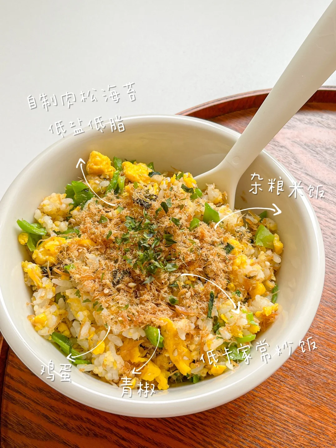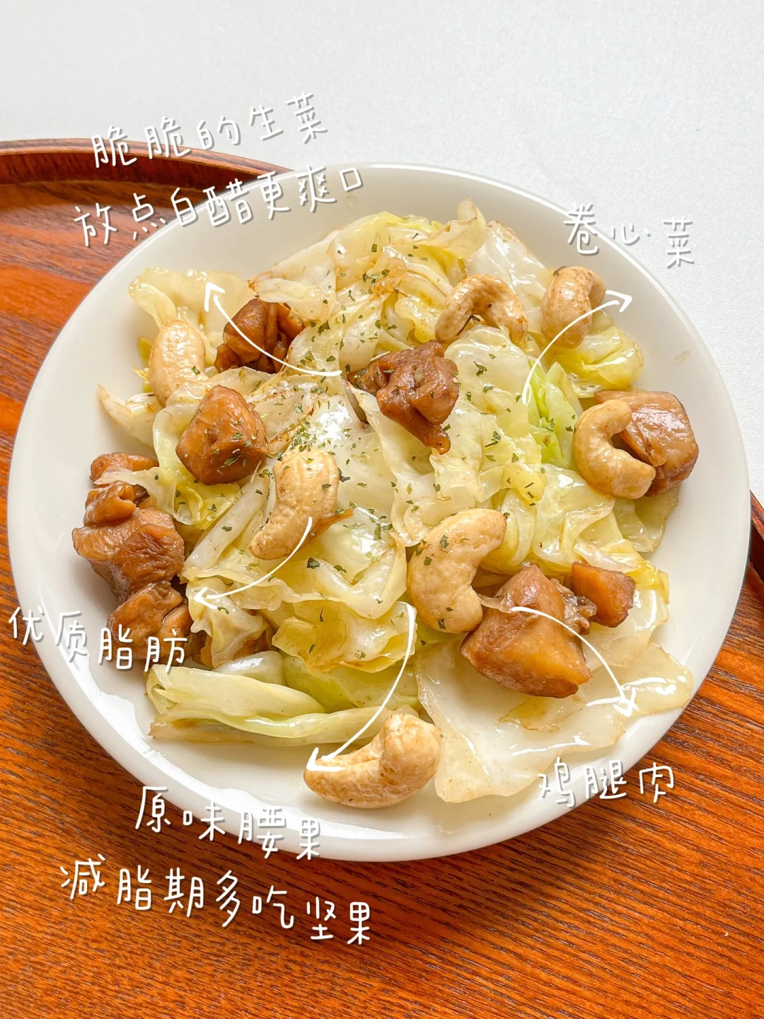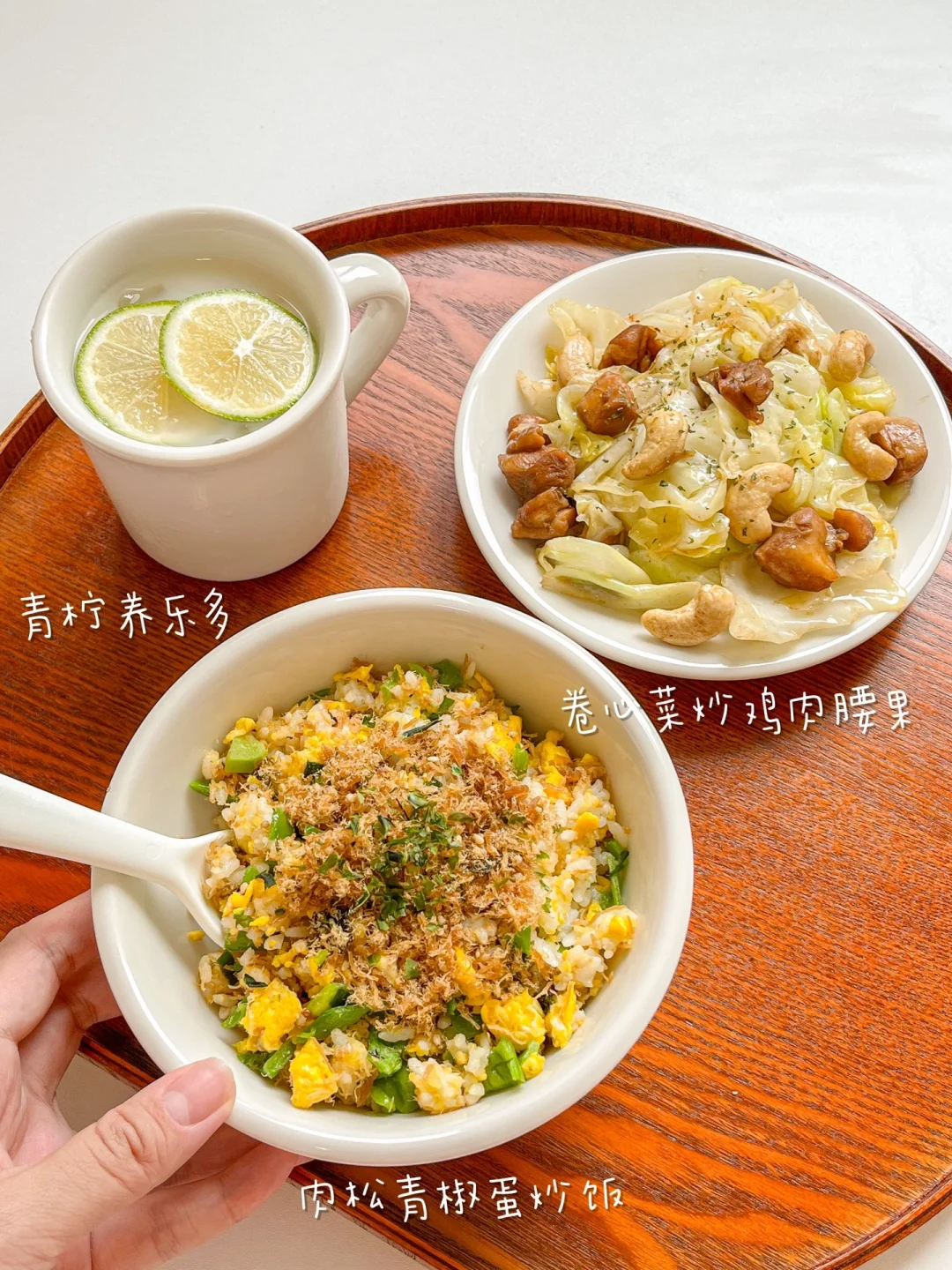 “不只有浓油赤酱菜才下饭,普通家常清淡小炒一样可以把米饭吃光光!” 今日午餐: ¹肉松青椒炒饭 ²卷心菜炒鸡肉腰果 ³青柠养乐多 🟢肉松青椒炒饭 外面的炒饭油都很大,嘴馋的话就自己在家做。控制好米饭的量,以蔬菜和鸡蛋为主,少油少盐就行。再放点自己做的海苔肉松,没有防腐剂,所以要尽快吃完。 🟠卷心菜炒鸡肉腰果 腰果香脆可口,含有大量营养物质,减脂期可以多吃坚果,但要吃原味的。但多吃会腻,把卷心菜的清爽搭配进来,加上少许白醋,能让口感变得更加丰富、爽口。