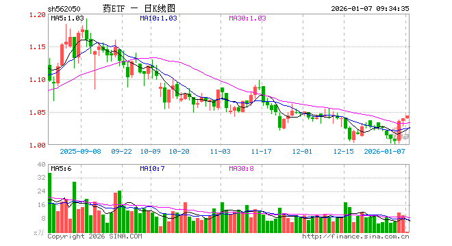 1月7日,药ETF(562050)开盘涨0.00%,报1.040元。药ETF(562050)重仓股方面,恒瑞医药开盘跌0.08%,片仔癀涨0.00%,云南白药涨0.05%,长春高新涨0.06%,科伦药业涨0.16%,复星医药跌0.26%,华东医药涨0.05%,新和成涨0.47%,百济神州涨0.04%,信立泰涨0.51%。