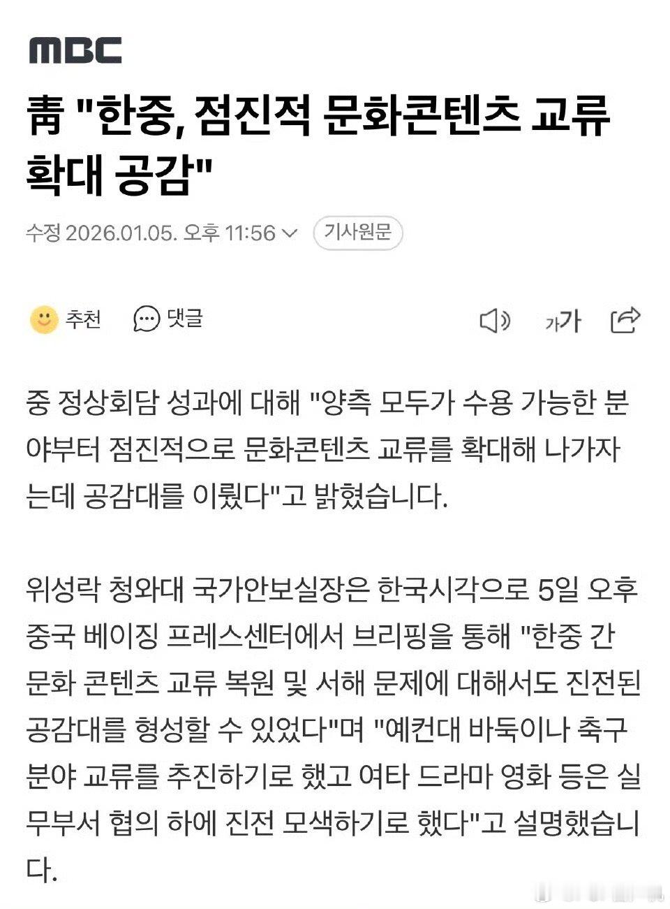 今天外交部回应:中韩双方都同意有序开展健康有益的文化交流。结合昨天青瓦台回应的:从双方都可接受的领域入手,逐步扩大文化内容交流达成了共识。青瓦台公布的细节有:双方决定推进围棋、足球等领域的交流,至于电视剧、电影等其他文化内容,则将通过相关实务部门的协商,探索进一步推进的可能性。