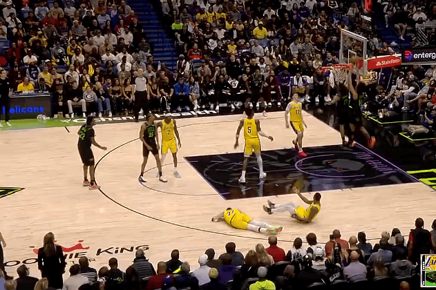 湖人两人防守抢位相撞倒地,鹈鹕两人抢空接结果没打进