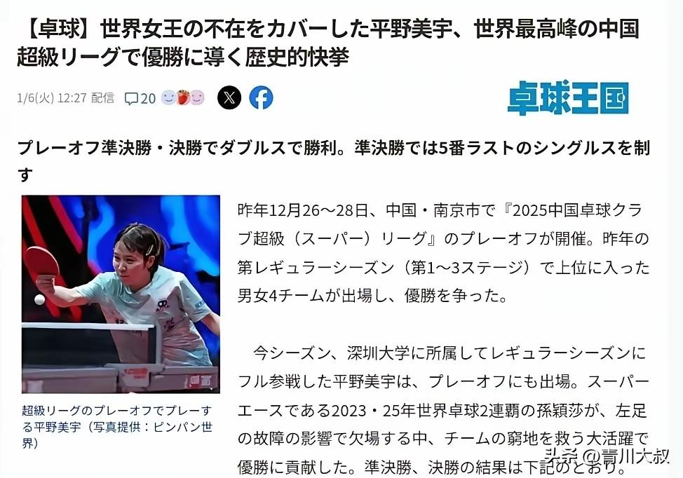 日本桌球王国夸平野美宇。却不小心打了日本T联赛的脸! 桌球王国报道: 中国乒超联赛, 是世界上最难打的比赛, 日本球员平野美宇, 能够征战一个赛季, 并帮助球队夺冠, 开辟了日本球员一次壮举! 我记得松岛辉空打完乒超联赛, 说T联赛没意思, 没几个能打的! 而张本智和更是退出T联赛, 去找东哥学习去了! 日本T联赛, 2026年大概率沦为鸡肋!