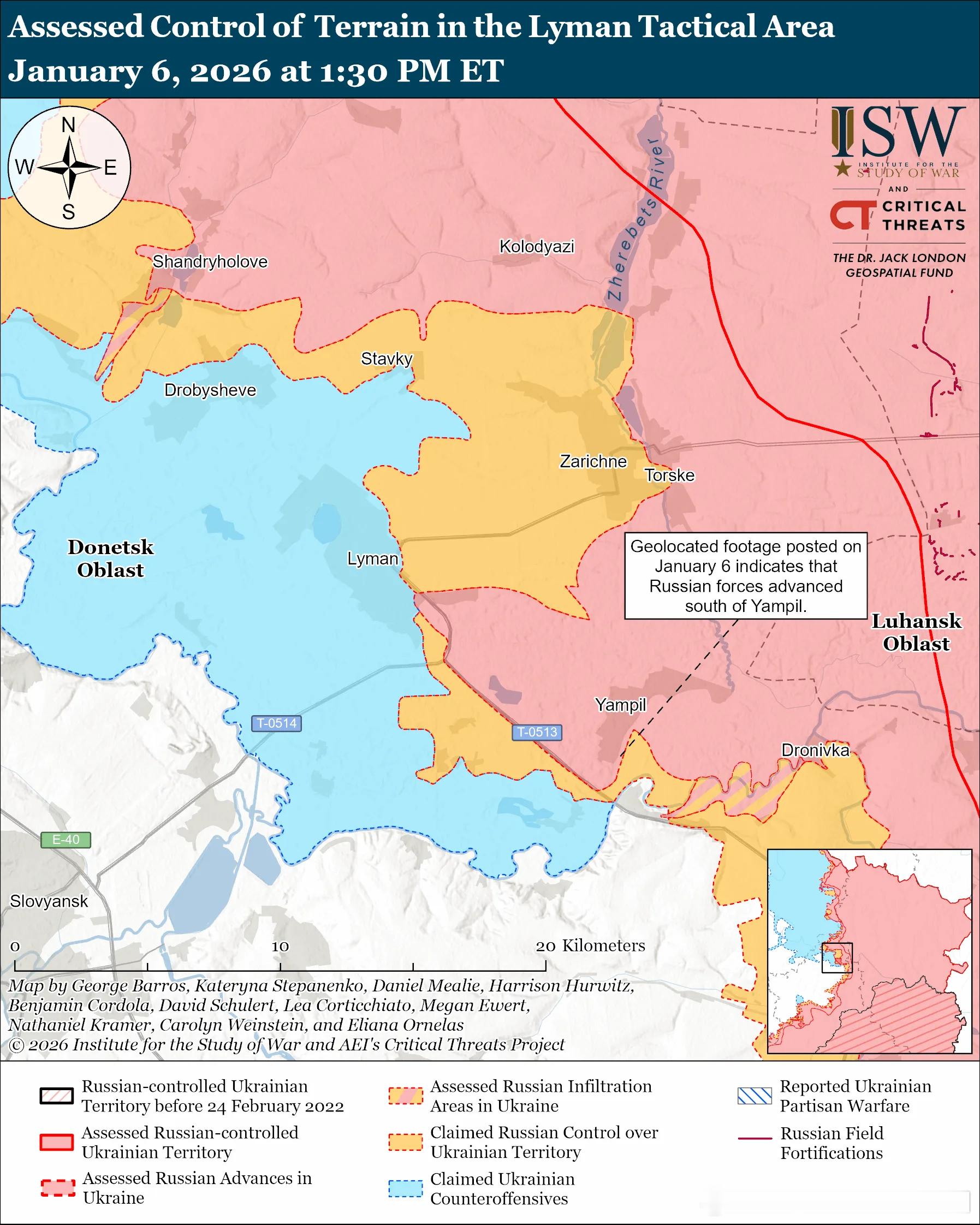 俄罗斯下属主要行动2俄军目标:占领卢甘斯克州剩余部分,向西推进至哈尔科夫州东部,并包围顿涅茨克州北部。1月6日俄军继续向库皮扬斯克方向发起进攻,但并未取得确切进展。未经证实的说法:一位俄罗斯军事博主于 1 月 6 日声称,俄军占领了皮沙内,并在库里利夫卡东部(位于库皮扬斯克东南部)和金德拉希夫卡北部(位于库皮扬斯克北部)取得了进展。1月5日和6日俄军从库皮扬斯克以西向库皮扬斯克方向进攻;从库皮扬斯克以北的德沃里昌斯克和彼得罗·伊万尼夫卡附近向金德拉希夫卡和库特基夫卡方向进攻;从库皮扬斯克东北部的奥德拉德内附近进攻;从库皮扬斯克以东向彼得罗巴甫洛夫卡方向进攻;从库皮扬斯克东南向库里利夫卡方向进攻。1月6日一名在库皮扬斯克方向作战的乌军旅的士兵注意到,由于缺乏植被,乌克兰军队更容易发现试图渗透到乌克兰阵地的俄军小股部队。作战序列:俄第47坦克师(第1近卫坦克集团军[GTA],莫斯科军区[MMD])第375独立反坦克炮兵营“孔托拉”分队的无人机操作员正在库里利夫卡东部打击乌克兰无人地面车辆(UGV)。第82摩步团(第69摩步师,第6合成集团军[CAA],列宁格勒军区[LMD])的炮兵部队和第352摩步团(第11军[AC],列宁格勒军区[LMD])正在库皮扬斯克方向作战。1月6日俄军继续向博罗瓦方向发起进攻,但并未取得进展。俄罗斯主张区域的细化:俄罗斯军事博客作者在 1 月 5 日和 6 日承认,俄军没有占领新普拉托尼夫卡,这与俄罗斯此前声称占领该定居点的说法相反。1月5日和6日,俄军在博罗瓦东北部的诺沃普拉托尼夫卡附近和博罗瓦东部的纳迪亚附近发动进攻。1月6日俄军继续在斯拉维扬斯克-利曼方向发动进攻,但并未取得确切进展。未经证实的说法:一位俄罗斯军事博主声称,俄军向索斯诺韦(莱曼西北部)的东部和东南部推进。1 月 5 日和 6 日,俄军在莱曼附近、莱曼西北部的德罗比舍韦附近以及索斯诺韦方向、莱曼北部的斯塔夫基附近、莱曼东北部的米尔内附近以及莱曼东部的扎里奇内附近发动了进攻。1 月 6 日一位俄罗斯军事博主声称,俄军正在通过莱曼南部和东南部的森林渗透到乌克兰防线,以躲避乌克兰无人机的侦察。作战序列:据报道俄罗斯鲁比孔先进无人技术中心的无人机操作员继续向莱曼方向袭击乌克兰军队。