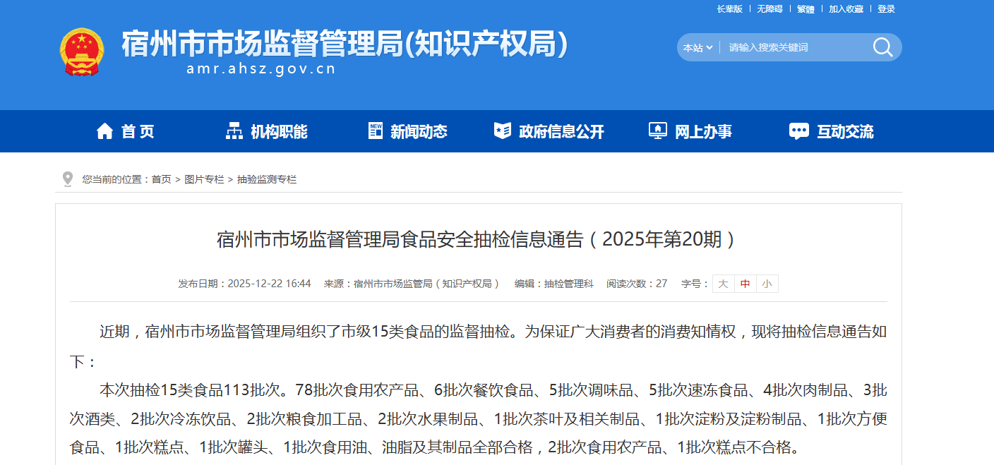 近期,宿州市市场监督管理局组织了市级15类食品的监督抽检。为保证广大消费者的消费知情权,现将抽检信息通告如下: