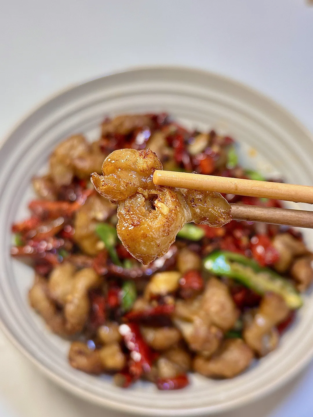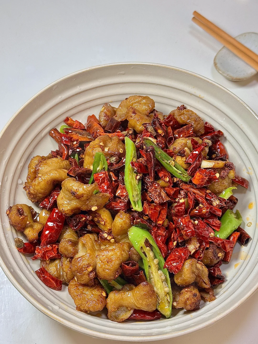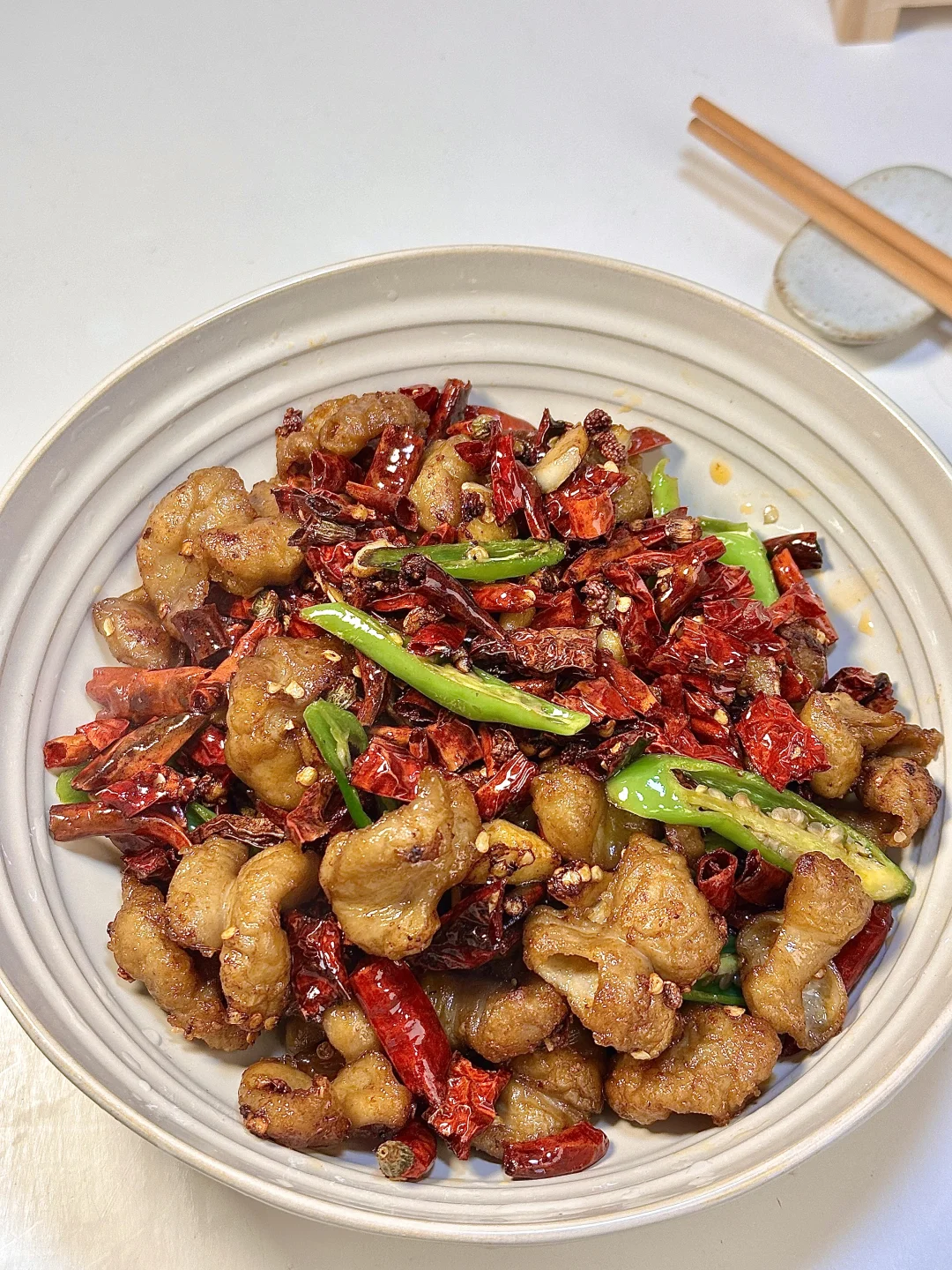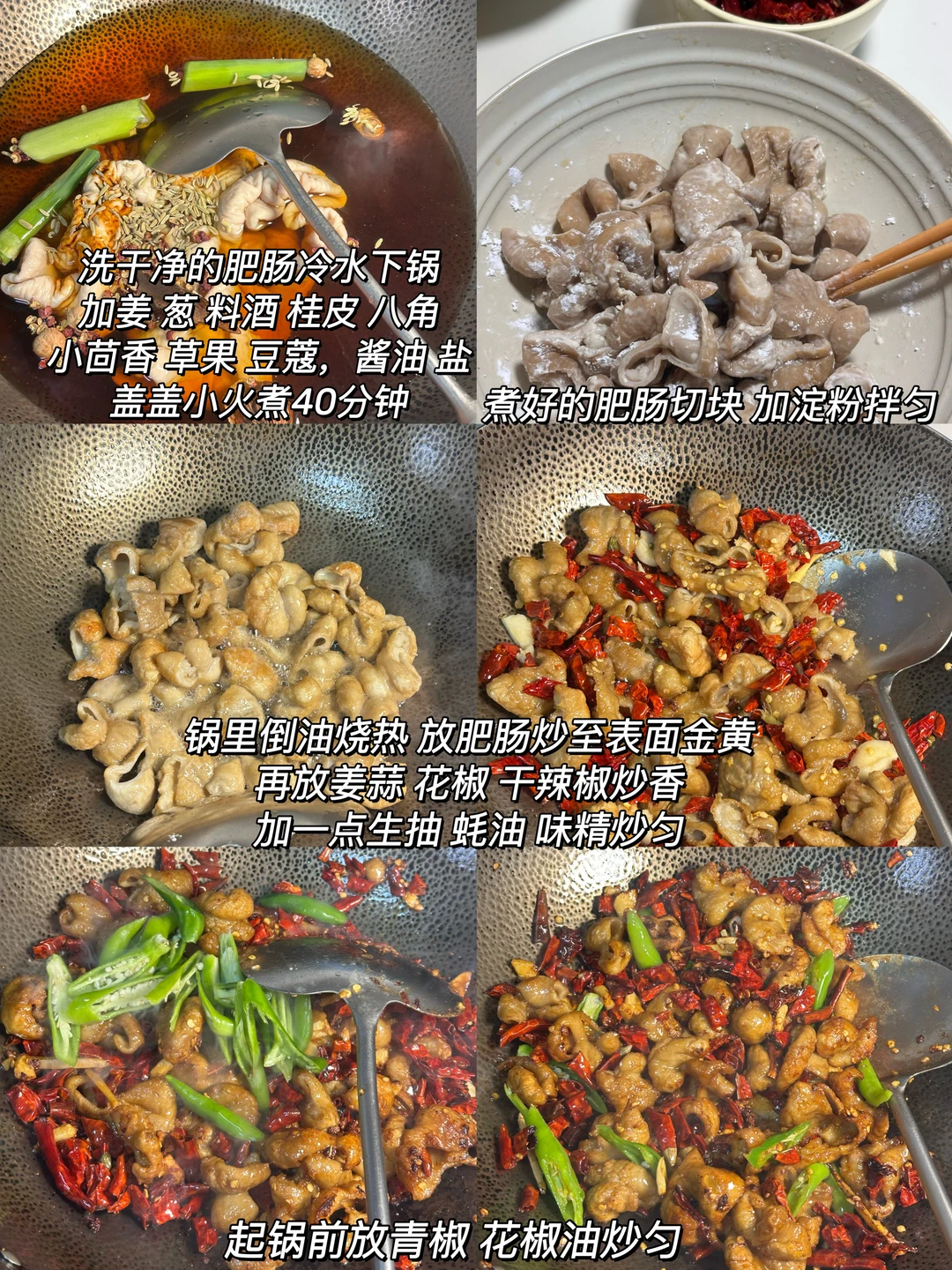 辣子肥肠,干香入味,肥肠爱好者好喜欢🤤 下饭又下酒,我买的肥肠是处理过的,买回来又拿面粉抓洗了两遍。 ✨食材:肥肠 姜 蒜 干辣椒 青椒 1️⃣:洗净的肥肠冷水下锅,加姜、葱、料酒、桂皮、八角、小茴香、草果、豆蔻(放家里有的大料)酱油、盐,盖盖小火煮40分钟。 2️⃣:煮好的肥肠切块,加淀粉拌匀。锅里倒油烧热,放肥肠炒至表面金黄,再放姜蒜、花椒、干辣椒炒香,加少许生抽、蚝油、味精炒匀。起锅前放青椒、花椒油,翻炒均匀。 好好吃饭呀🖖🏻