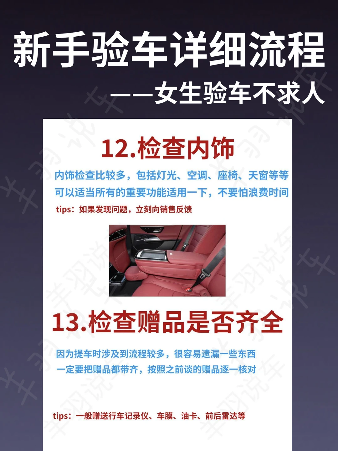 🚗买车本是件令人开心的事情 可是一想到提车时要验车 真让人头大 对汽车部件一窍不通 就连基础的远近光灯、雾灯、转向灯、示廓灯都不清 怎么去对一辆庞然大物做详细的检查呢 甚至有姐妹还请了专业人员验车 那大可不必 🚘其实,验车是件简单的事情 不要把问题复杂化 就像你去旅游一样 把要带的东西列个清单 每当收到行李箱之后 就在后面打个✔️ 你会发现特别清晰 一目了然,不重不漏 验车也是同理,把要检查的列出来 每验完一项,☑️ 很快就验完了 希望可以帮助到正在为验车一筹莫展的姐妹👭
