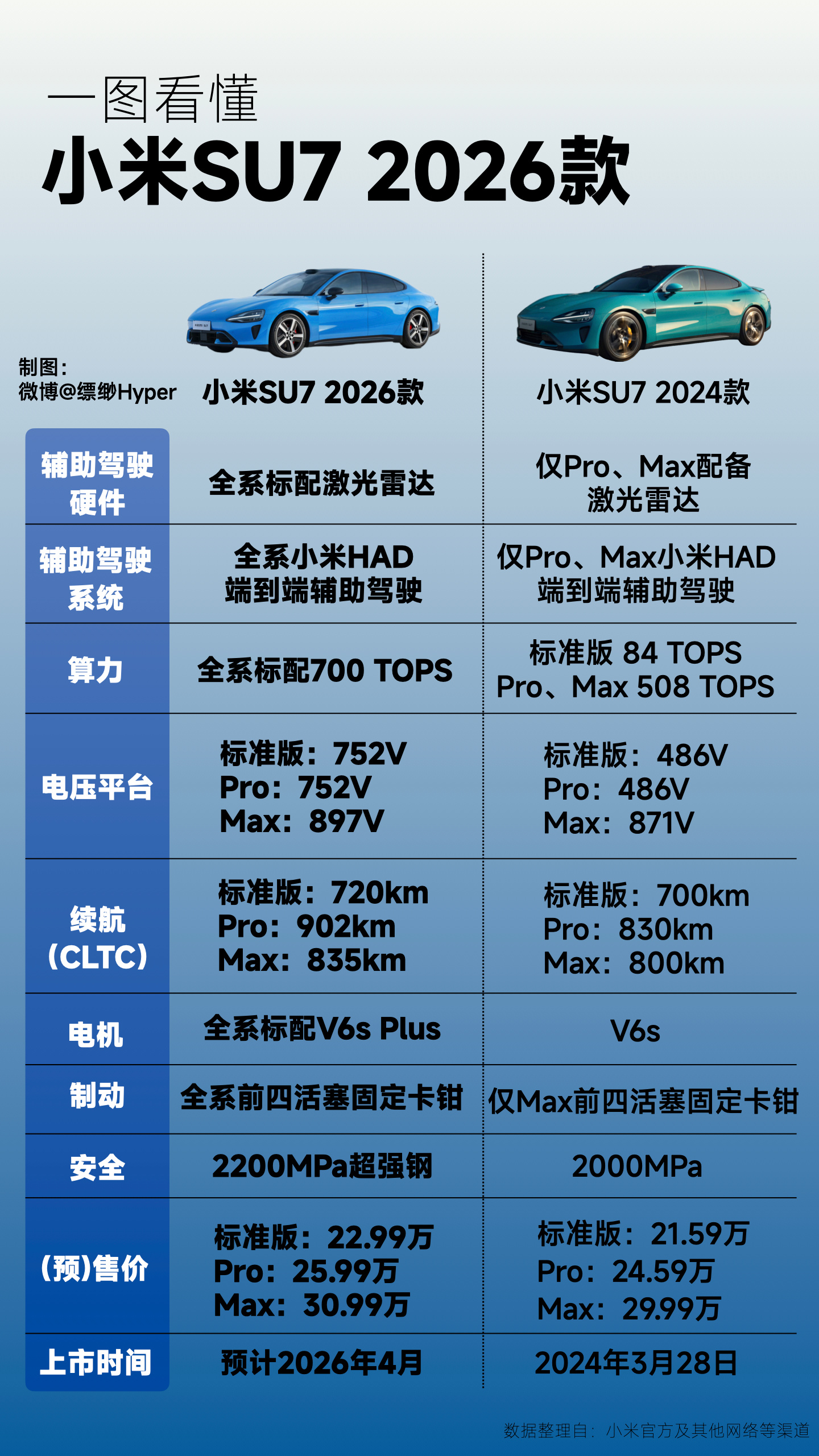 评价为:很有竞争力价格配置对比是这样:新一代小米SU7的标准版,22.99的配置大概相当于上一代的24.59 Pro版本额外升级(补上激光雷达,算力提升,升级800V平台,升级座舱,动力,安全防护)新SU7的Pro版本,25.99,续航暴涨到900km,底盘直接升级到了上一代30w Max都没有的完整闭式双腔空簧+CDC可调阻尼减震器,驾驶质感和底盘堆料是上一代30万级别的,安全性的什么都是标配就不说了。新SU7的Max版本,30.99,升级底盘【老Max是单腔空簧】,算力,座舱,动力进一步提升,续航涨了35km,再加上4D毫米波雷达主动安全,以及【xx】,【xx】