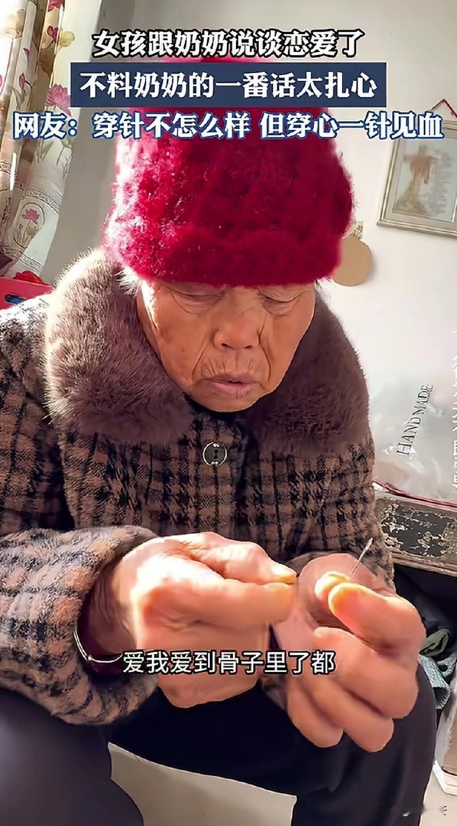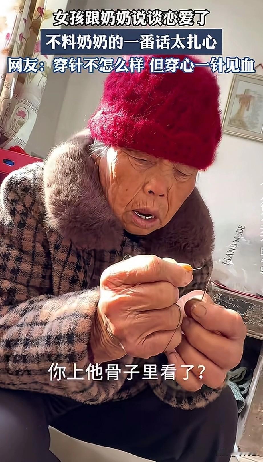 孙女:奶奶,我又新谈了一个男朋友,对我可好可好,爱我爱到骨子里。 奶奶:你上他骨子里看了,你拍片看了他骨子里有你? 江苏一女子和奶奶聊天,孙女一脸幸福的给奶奶说自己交了一个男朋友,对她非常好,希望奶奶可以感受她的幸福。 不料奶奶波澜不惊,头都没抬,手里依然在引线穿针干活,丝毫没有对在意孙女的话。 奶奶满口银牙,没有一丝兴奋,反而一盆冷水泼下来,反问孙女,骨子里的东西能看到? 相比起孙女的恋爱甜蜜,奶奶的反应更让人清醒,就如网友所说,奶奶虽然眼神不好,可脑子好用的没的说,相比起年轻人的儿女情长,奶奶多年的经验告诉你,真心不真心不是嘴上说说的。