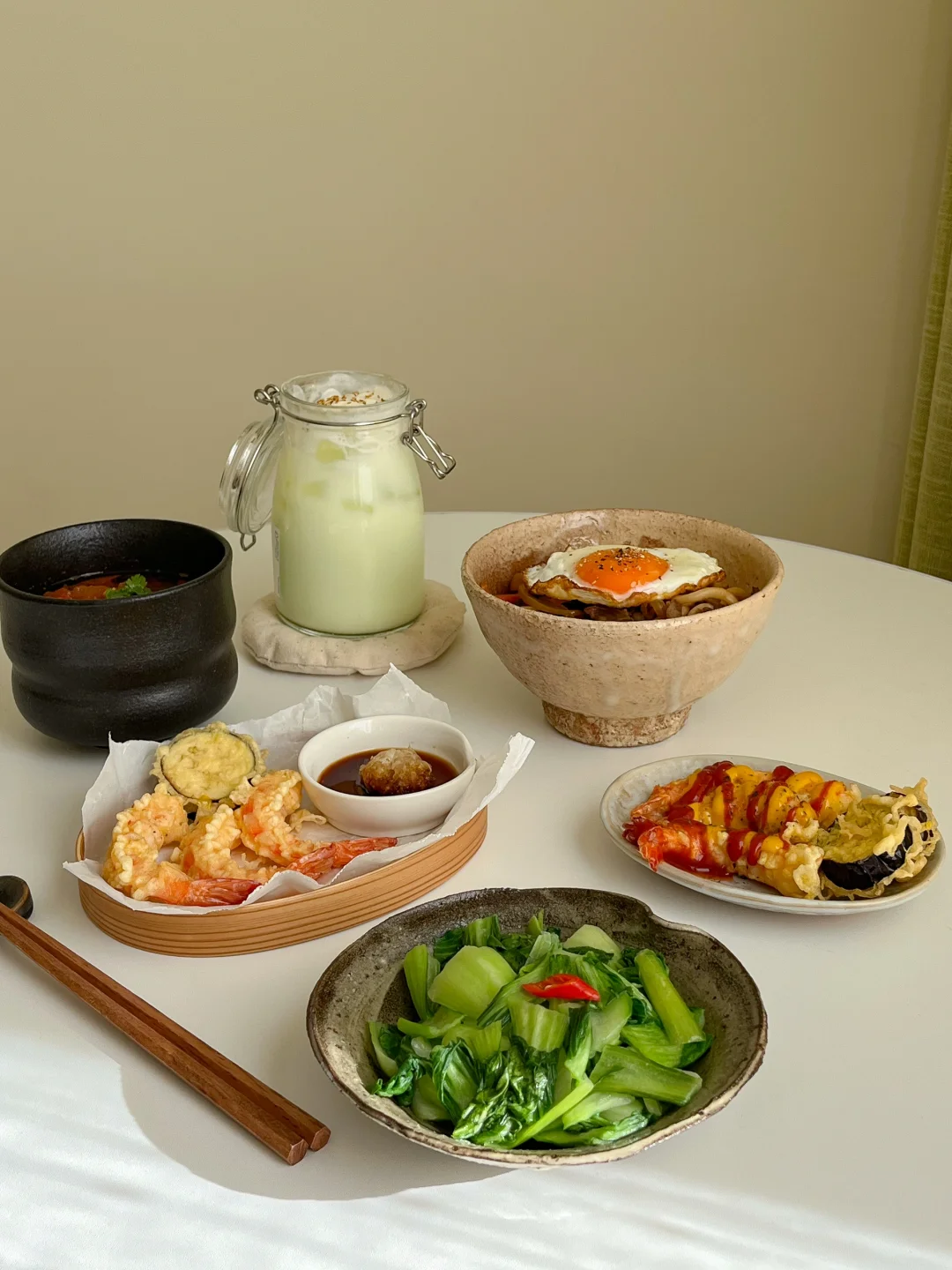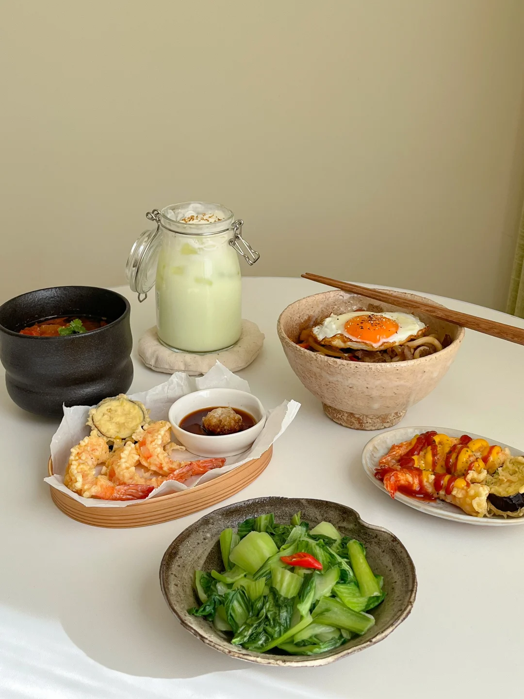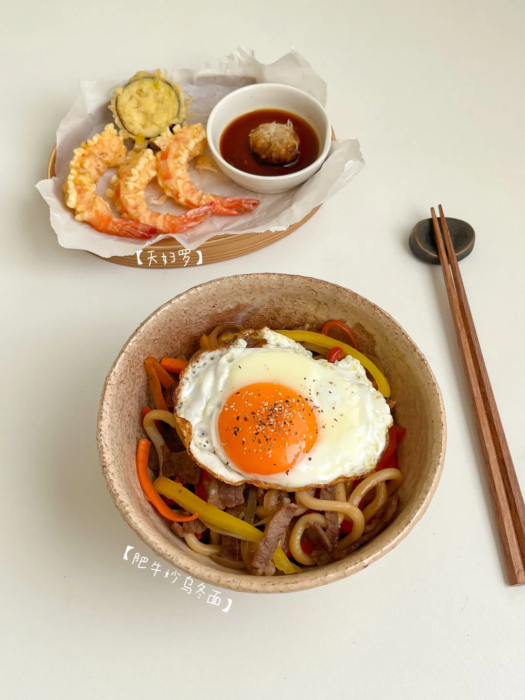 今天的饭: 天妇罗🍤 肥牛炒乌冬面🍜 香菜番茄汤🍅 炒青菜 哈密瓜牛奶🥛 2025年的新年第一餐~ 继续热爱我的小生活