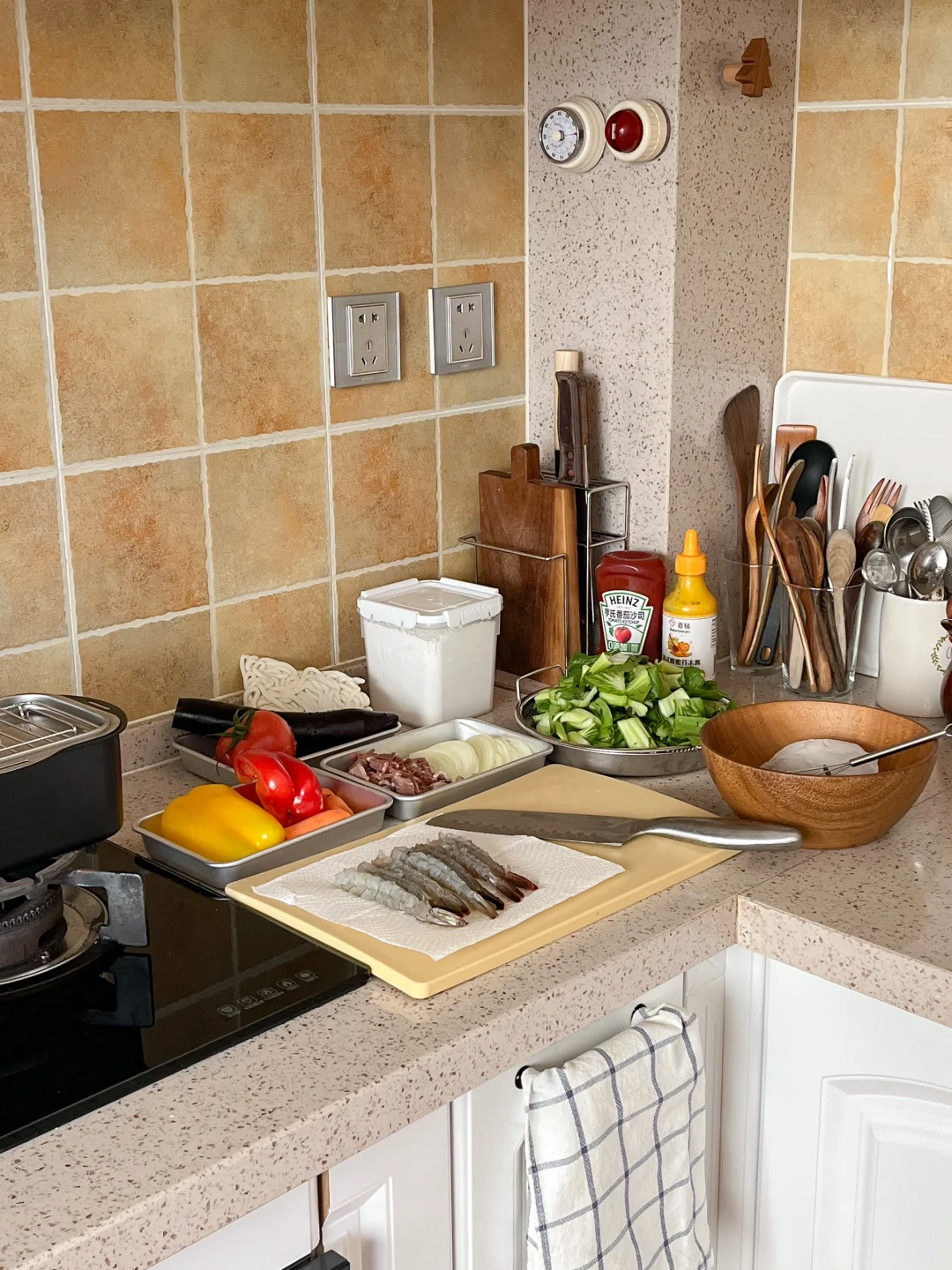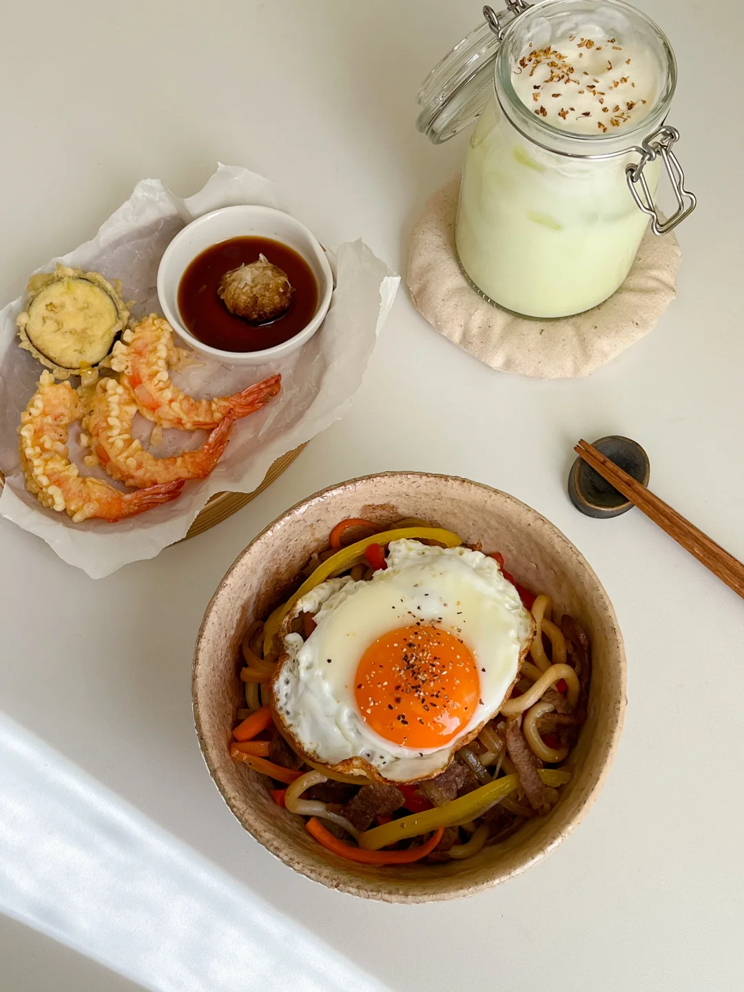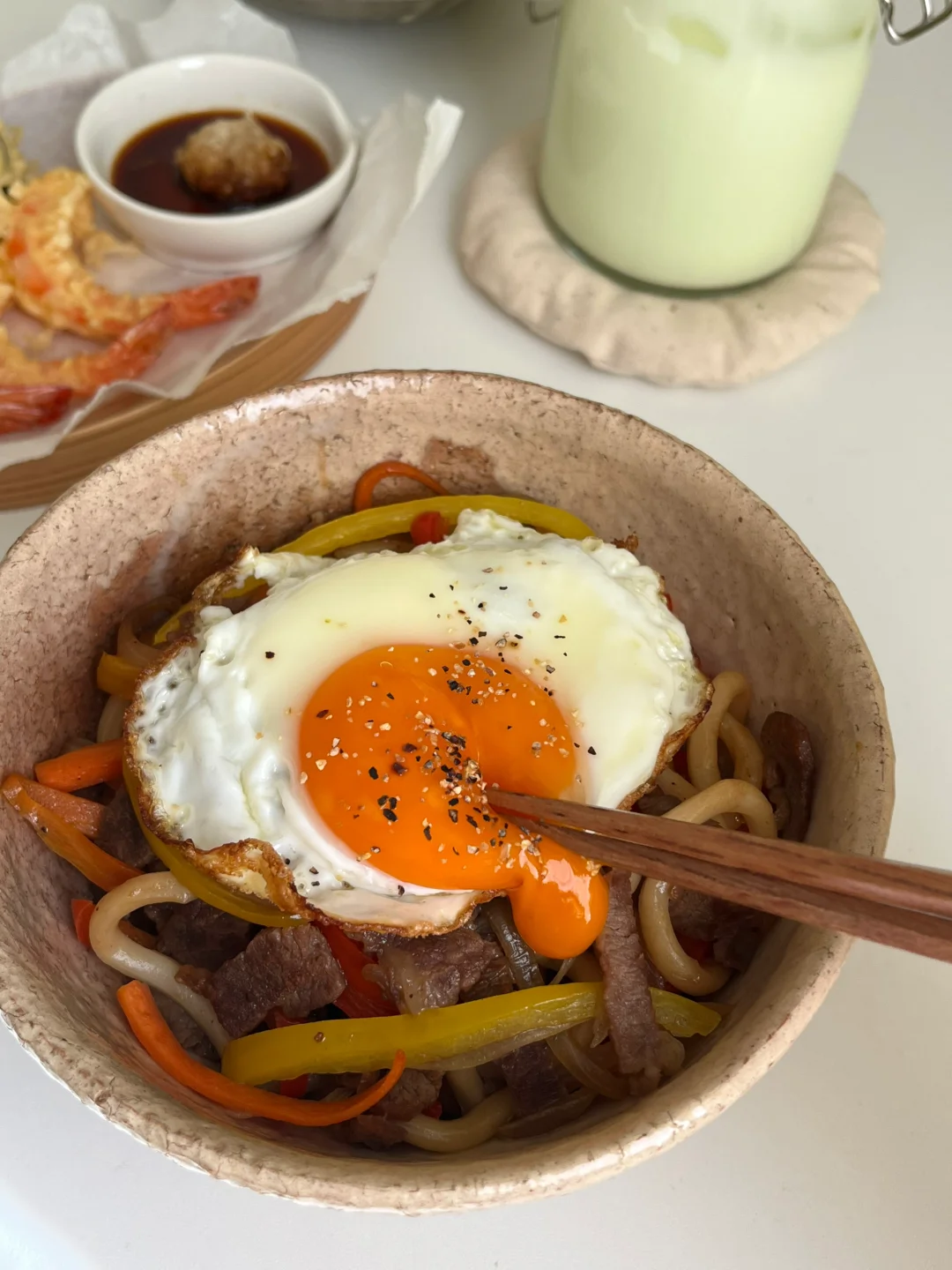 今天的饭: 天妇罗🍤 肥牛炒乌冬面🍜 香菜番茄汤🍅 炒青菜 哈密瓜牛奶🥛 2025年的新年第一餐~ 继续热爱我的小生活